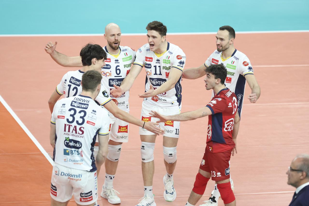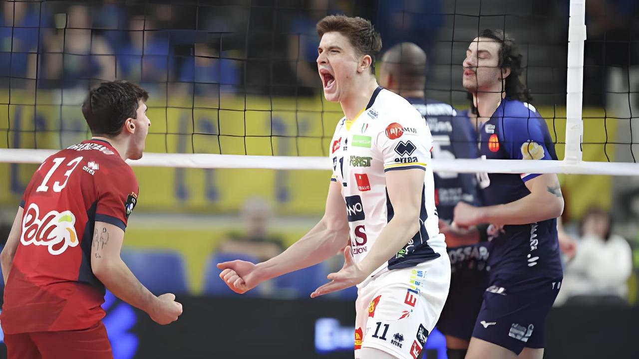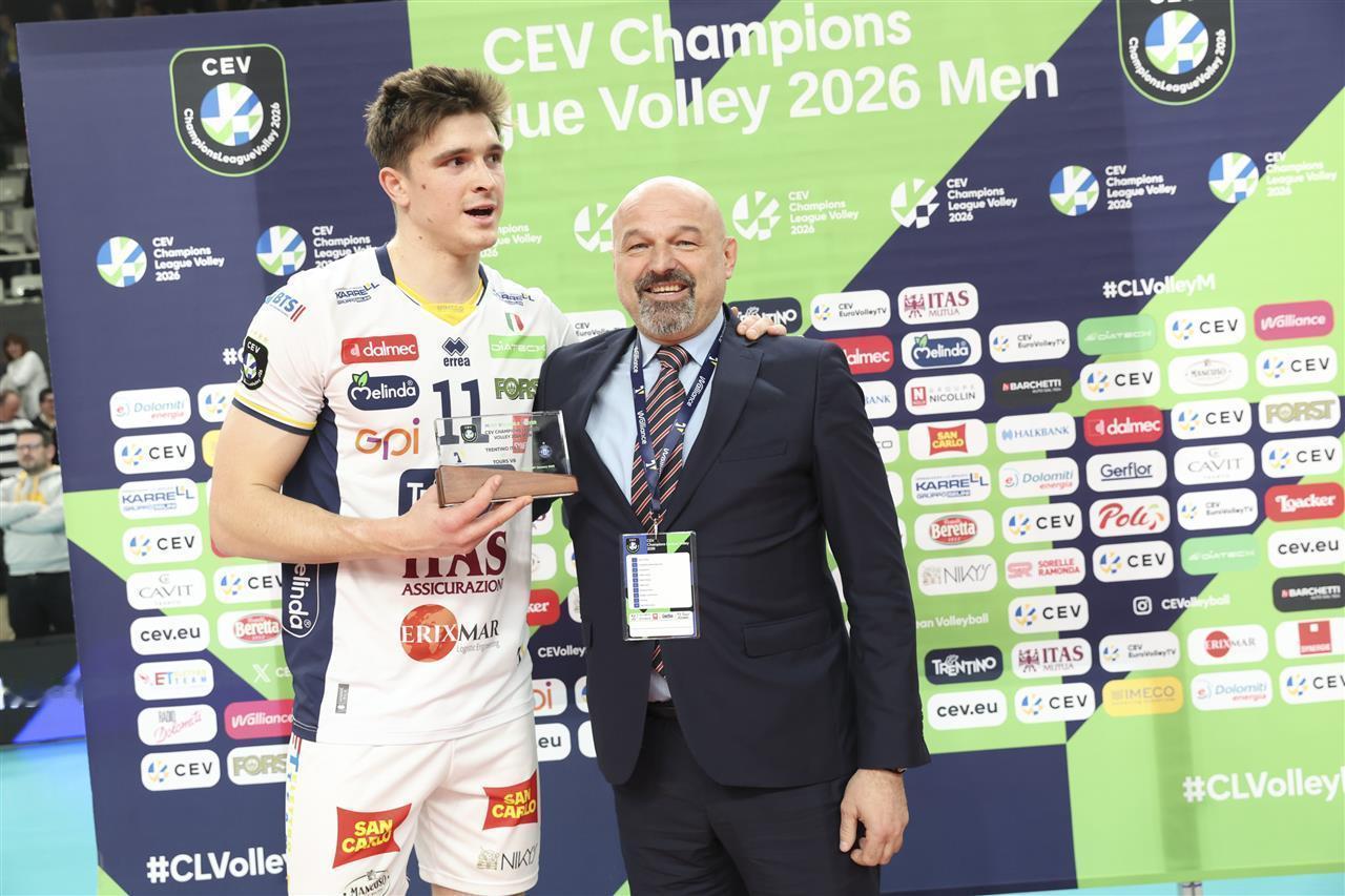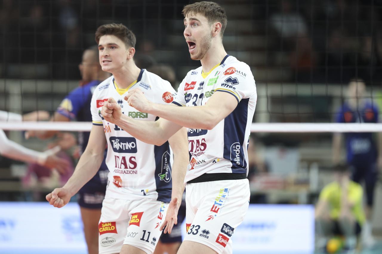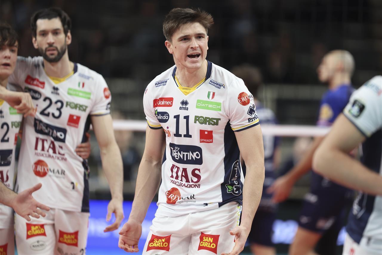 【弗雷40分 特伦蒂诺3:2大逆转国图尔】 欧冠男排A组小组赛第四回合 意大利特伦蒂诺主场3:2大翻盘法国图尔 五局比分为:25-27、24-26、25-23、25-22、28-26 此役两队鏖战2小时37分钟! 法国接应弗雷豪砍40分! 扣球60中35、6失误3被拦、5发、双率58%43% 拉蒙23分、弗拉维奥11分、托维10分、吉亚尼10分 打得如此胶灼跟两位名将都休战关系很大 米切莱托+拉维亚都因伤只能在场边拍手