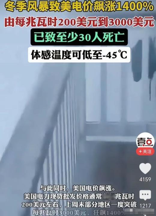 看看西方的资本家天天鼓吹所谓的完全市场经济。全美一场暴雪,电价直接涨了1400%,看了真让人寒心。 这场冬季风暴,席卷了美国22个州,超1.7亿人被纳入极端天气警报,体感温度直逼零下46摄氏度,积雪厚度突破30厘米,截至目前已经造成至少30人遇难,其中还有8名无家可归者被活活冻死在纽约街头。 极端严寒之下,电力成了美国人活下去的救命稻草,可谁能想到,救命的电力,却被资本变成了牟取暴利的工具。 可能很多人没概念,平时美国电力批发价大概在每兆瓦时200美元左右,折算下来每度电也就0.2美元出头。 可这场暴雪一来,一切都变了,部分地区的电力现货批发价直接飙升到每兆瓦时3000美元,涨幅足足有1400%,折算下来每度电接近3美元。 要知道,这还只是批发价,等传到老百姓手里,加上各种服务费、税费,零售价只会更高,普通家庭根本承受不起。 华盛顿特区有位居民凯瑟琳,平时冬天每个月电费也就180美元左右,今年最冷这一个月,账单直接涨到了近230美元,即便她刻意减少用电,晚上不敢开足暖气,还是经常被冻醒,只能裹着厚毛毯硬扛。 纽约有三个年轻人合租一套公寓,往年冬天每人平摊的电费也就150美元,今年最冷月份,每人要多掏70多美元,为了凑电费,他们不得不取消健身房会员,推迟更换电子设备的计划。 更让人揪心的是,这场电价暴涨,受伤最深的还是低收入家庭和弱势群体,数据显示,早在暴雪来临前,全美就有大约1400万户家庭拖欠电费,债务总额高得惊人。 如今天价电费来袭,这些家庭更是雪上加霜,有63岁的退休护士,为了照顾95岁的母亲,不得不找远程兼职,就为了填补电费缺口,她说以前加班是为了存钱,现在加班只是为了不被断电。 最讽刺的是,西方的资本家们,天天在全世界鼓吹完全市场经济,说这是最公平、最高效的模式,可真相呢?所谓的完全市场经济,不过是他们为自己量身定制的敛财外衣,一旦遇到灾难,就彻底露出了本性——不管老百姓的死活,只要能赚钱,就敢疯狂抬价,把灾难变成自己牟利的盛宴。 很多人可能会疑惑,一场暴雪而已,为什么电价会涨得这么离谱?其实根本不是偶然,而是美国能源系统的结构性顽疾,加上资本的贪婪,在极端天气下的集中爆发。 美国的电力生产高度依赖天然气,而这场暴雪导致12%的天然气产能停工,供应骤减,发电成本直线上升。 更关键的是,美国的电网早就超期服役了,平均使用年限超过40年,70%的输电线路都是“老古董”,暴雪一来,线路结冰断裂、设备故障频发,电力供应大幅缩水。 更离谱的是,美国电力市场还有一个奇葩现象:一边是东部重灾区电价狂涨,突破3000美元/兆瓦时;一边是芝加哥等中西部地区,因为电力送不出去,出现了每兆瓦时-227.93美元的负电价,也就是说,发电商要倒贴钱请人用电。 之所以会出现这种荒诞的情况,就是因为美国电网各自为政,3000多家私营电力企业各自牟利,没有统一的调配机制,只能眼睁睁看着“有电送不出,缺电买不起”。 更让人无奈的是,美国政府的应对措施,根本就是杯水车薪,虽然推出了低收入能源援助项目,但每人只能拿到250美元左右的补贴,面对天价电费,这点钱根本起不到任何作用,美国能源部虽然发布了紧急命令,允许发电厂满负荷运行,但老化的基础设施,根本撑不起这样的需求。 美国的这场电价危机,从来都不是天气的错,而是资本贪婪和制度缺陷共同造成的悲剧,资本家们掌控着电力资源,追求利益最大化是他们的唯一目标,老百姓的冷暖、死活,从来都不在他们的考虑范围内。 他们鼓吹的完全市场经济,从来都不是为了普通民众,而是为了让自己的利益不受约束,可以肆无忌惮地敛财。 大家对此有什么看法呢?欢迎各位在评论区留言!