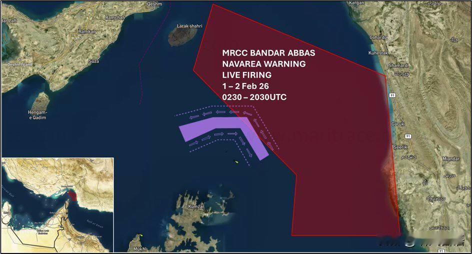 伊朗将举行海上实弹演习!此次表现极为硬气! 伊朗已告知霍尔木兹海峡的海上交通,将于2026年2月1日至2日举行海军实弹演习。演习期间,船只将被要求按特定航线穿越海峡。 目前,伊朗阿巴斯港 MRCC 在霍尔木兹海峡东部、伊朗西里克附近,发布了一则2月1日至2日0230UTC–2030UTC期间的NAVAREA警告。 这则NAVAREA警告实际上限制了2026年2月1日至2日0230–2030 UTC期间,经霍尔木兹海峡进港航道“进入”阿拉伯湾的海上交通。图2为航线,靠近阿曼的海域对部分船只而言水深过浅。