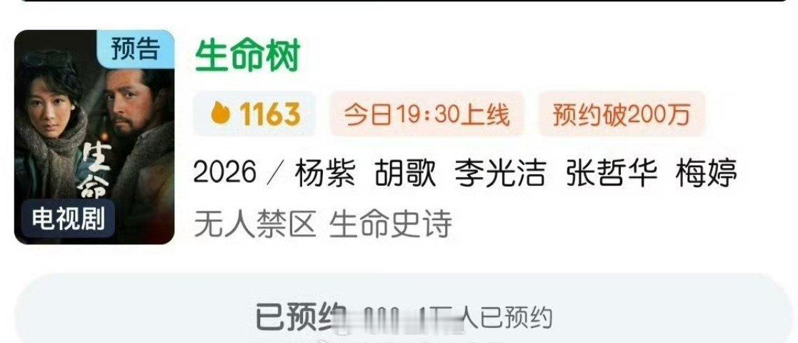 杨紫胡歌《生命树》今晚开播,爱奇艺预约量已破200万