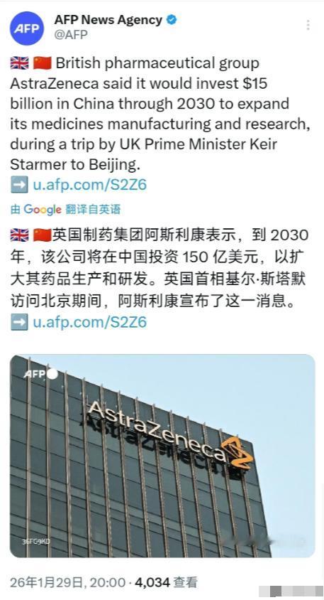 英国宣布了一条让特朗普恼羞成怒的新闻! 法新社1月29日晚报道:“英国制药集团阿斯利康表示,到2030 年,该公司将在中国投资150亿美元,以扩大其药品生产和研发。英国首相基尔·斯塔默访问北京期间,阿斯利康宣布了这一消息。” 这家英国制药巨头早在1993年就进入中国市场,如今中国已是它的全球第二大市场,在华设有两个全球战略研发中心、四个生产基地,现有员工超1.7万人,旗下产品供应全球70多个市场。 这次150亿美元的投资,可不是简单的资金注入,而是覆盖从药物发现、临床开发到生产制造的完整价值链,重点发力细胞治疗、放射偶联药物等前沿领域,还要升级无锡、泰州等现有基地,甚至计划新建生产基地,未来在华员工规模将突破2万人,还能带动医疗生态链新增数千个岗位。 就在去年3月,阿斯利康刚宣布过25亿美元的在华投资计划,短短一年再放大招,足以看出中国市场在其全球布局中的核心地位。 这个投资消息是在英国首相斯塔默访华期间宣布的,背后藏着英国对华政策的明显转向。这是英国首相时隔8年再次访华,斯塔默此行带了50多家英国大企业高管,核心目的就是深化中英经贸合作,摆脱此前英中关系的“冰河时代”。 他早就明确表态,忽视中国是不明智的,英国不必在美国和中国之间做选择——既会保持和美国的紧密联系,也不会放弃和中国这个全球第二大经济体合作的机遇。 要知道,中英双边货物贸易额2025年已达1037亿美元,服务贸易额逼近300亿美元,双向投资存量近680亿美元,中国还支撑着英国37万个就业岗位,对英国来说,和中国务实合作是实实在在的民生与经济红利,阿斯利康的投资,正是这种务实政策的具体体现。 这恰恰戳中了特朗普的痛处,也是他恼羞成怒的核心原因。一直以来,特朗普奉行对华强硬政策,不光自己搞贸易保护,还频频施压盟友和中国“脱钩断链”,甚至动辄用关税威胁那些和中国合作的盟友。 就在不久前,加拿大只是和中国理顺了部分经贸问题,特朗普就翻脸威胁要加征100%关税,还宣称中国会“吞噬”加拿大,本质上就是想维护一种特权——只有美国能和中国谈合作,其他盟友只能跟着自己围堵中国。 可英国作为美国的核心盟友,如今却让本土巨头高调加码对华投资,相当于公开“不听指挥”,直接打破了特朗普构建的对华围堵网。 让他焦虑的是,英国的选择可能引发连锁反应,此前法国、德国等欧洲国家已经纷纷深化对华合作,英国再跟进,意味着他的围堵策略彻底失去了盟友支持,成了孤家寡人。 说到底,阿斯利康的投资决策,核心是市场规律说了算,和政治博弈无关。中国不仅有庞大的医药消费市场,还有完善的科研体系和供应链,阿斯利康在华的研发中心能和500多家临床医院合作,主导大量全球临床试验,中国的创新成果还能通过它推向世界。 对企业而言,哪里有市场、有创新活力、有合作机遇,资金就会流向哪里,特朗普的政治施压,终究敌不过市场的理性选择。 更何况,这次投资是双赢的——阿斯利康能借助中国的优势扩大全球竞争力,中国也能借助其技术和资金提升医药研发与制造水平,让更多前沿疗法惠及患者,这正是全球化的应有之义。 特朗普的恼羞成怒,本质上是霸权思维和现实规律的碰撞。他总想用强权左右盟友的选择,用对抗替代合作,却忽视了全球化时代,各国利益早已深度绑定,没有哪个国家能孤立发展。 英国的务实选择,恰恰说明当代国际关系的核心是互利共赢,而不是非此即彼的对抗。 阿斯利康的150亿美元投资,不仅是一笔商业布局,更像是一个信号:任何试图逆全球化、搞阵营对立的做法,终究会被市场和理性打败。 信息来源: 澎湃新闻《阿斯利康宣布2030年前在华投资逾1000亿元,扩大药品产研布局》(2026年1月29日) 今日俄罗斯RT微博报道(2026年1月30日) MCN双量进阶计划