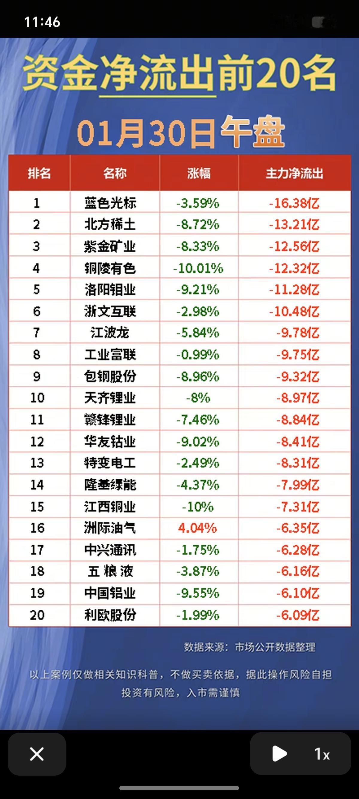 1.30周五 主力资金 抢筹出逃个股榜 ! 资金 抢筹热点: 1.养殖板块 2.农业种植 3.煤炭开采 4.水产品 5.装修装饰 资金出逃:资源股,有色金属