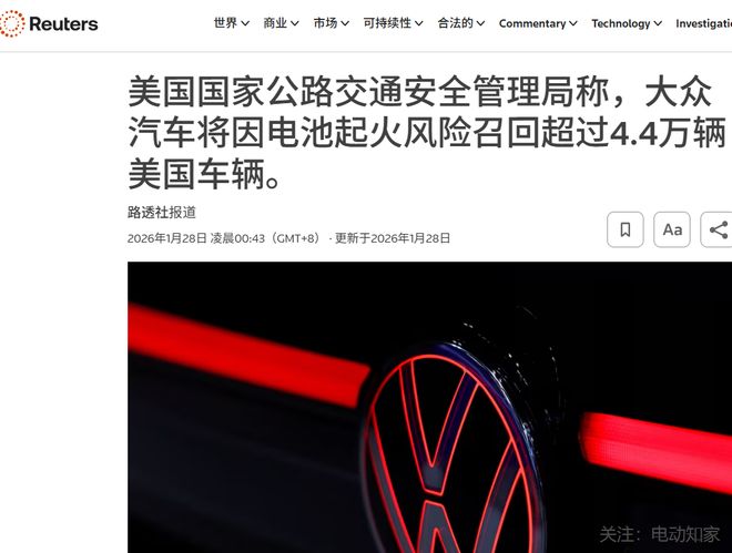 电动知家消息,1月28日,据路透社报道,美国国家公路交通安全管理局(NHTSA)正式披露,大众汽车将在美国分两批召回共计44551辆ID.4纯电动车型,召回核心原因是高压电池系统存在热失控及起火风险。