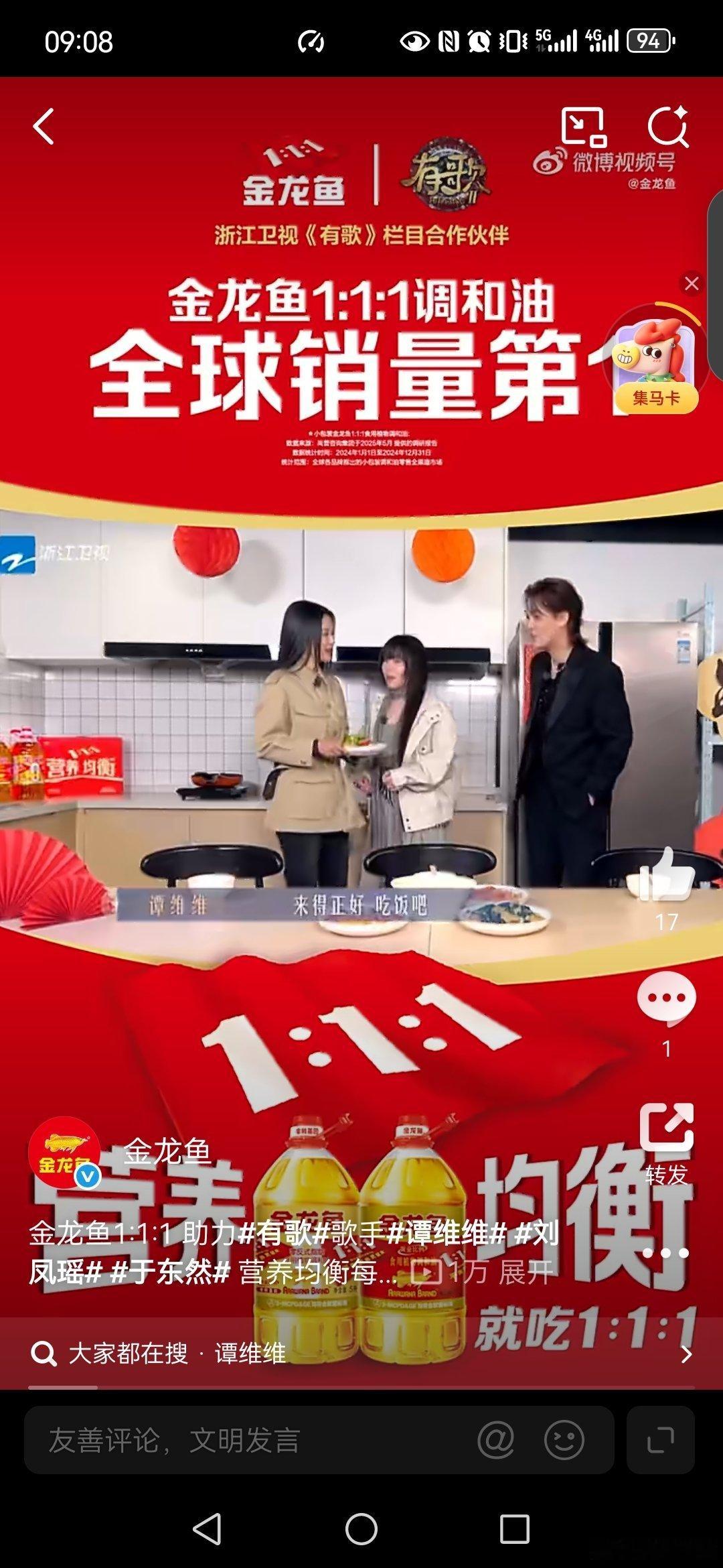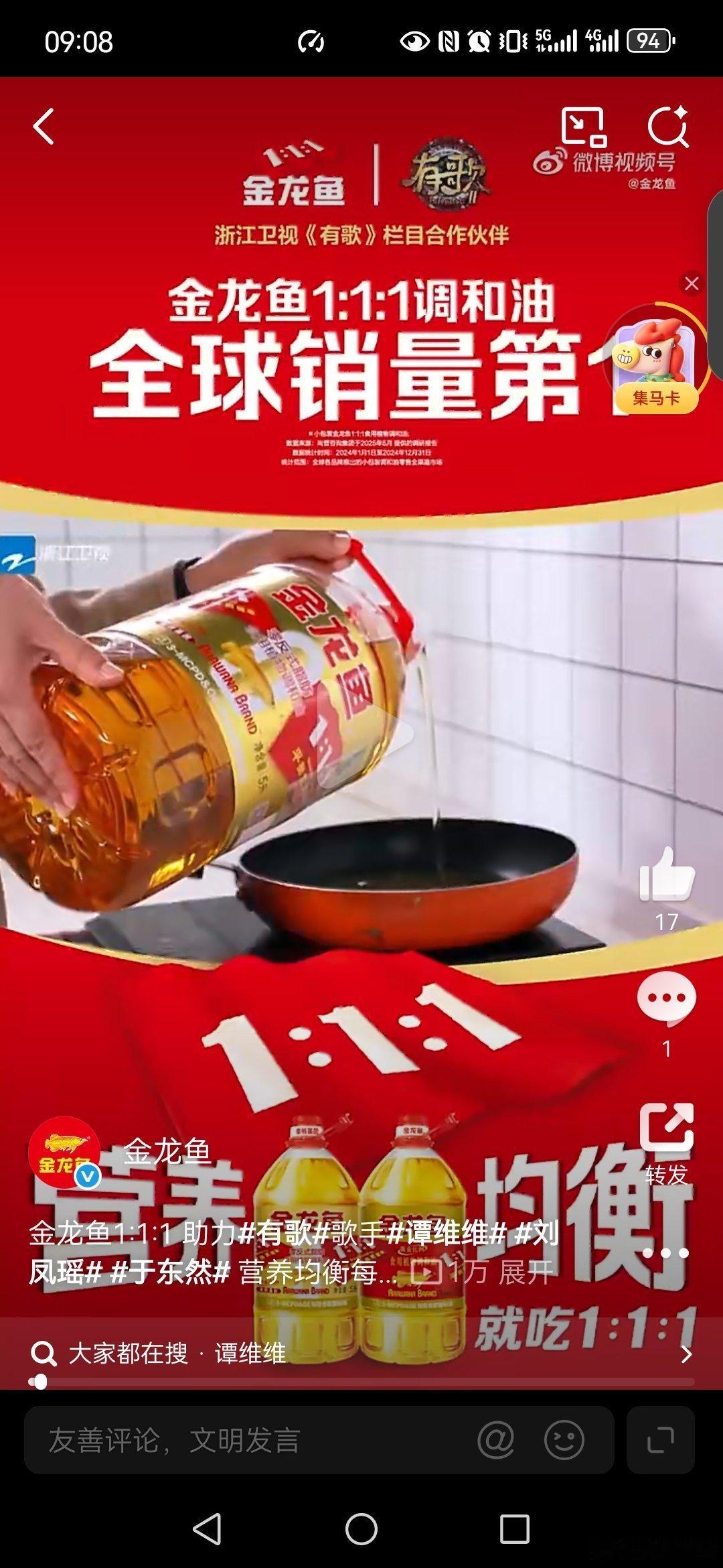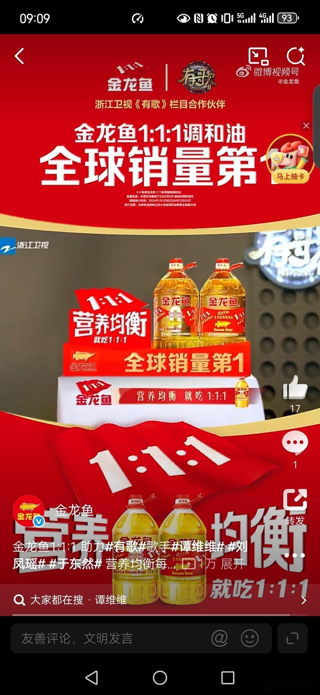 营养均衡就吃1:1:1有歌第二季 观看了金龙鱼1:1:1 助力有歌歌手谭维维刘凤瑶于东然 ,《有歌》第二季,很不错,其实在生活中我一直比较注重营养均衡,在家里一直使用金龙鱼1:1:1 炒菜,做饭等,因为: 一是脂肪酸均衡配比。科学配比,适合长期食用。