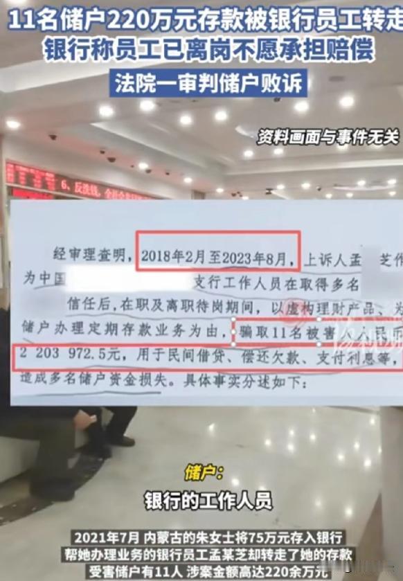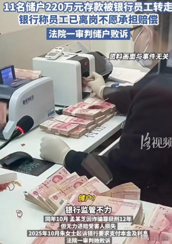 内蒙古,朱女士省吃俭用攒下75万,因担心放家里不安全,便存进银行,可柜员孟某竟偷偷将朱女士及另外11名储户共220多万转走并挥霍,孟某入狱后无力偿还,朱女士认为银行该担责,找银行却被拒,银行称孟某已离职不负责,朱女士起诉银行索赔75万及利息,却意外败诉,她决定继续上诉追回自己的75万元。 朱女士这辈子不容易,年轻时候在工地给工人做饭,天不亮就得爬起来,夏天热得要命,冬天冷得手都裂口子,后来年纪大了,改摆早点摊,起早贪黑,被蚊子咬得满身包,就为了多攒点钱。 攒了半辈子,好不容易攒下75万,这钱对她来说,那就是命根子,有了这笔钱,心里踏实,养老都有底了。 钱放家里不放心,朱女士琢磨着,还是得存银行,安全,她选了一家看着靠谱的银行,那天去存钱,接待她的是柜员孟某。 朱女士啥也不懂,孟某让她干啥她就干啥,身份证、银行卡递过去,让签字就签字,让按手印就按手印,全程都听孟某的。 办完手续,朱女士拿着回执单,特意看了一眼,上面写着存款,这才放心回家,心里想着,这下钱安全了,以后用钱的时候再取。 可谁能想到,没过多久,朱女士家里有点事,需要用钱,她去银行一查,当时就懵了,账户里一分钱都没有,75万没有了。 她腿都软了,差点没站住,赶紧问银行工作人员,工作人员查了半天,告诉她,钱被孟某转走了。 朱女士急得直哭,问孟某在哪,工作人员说孟某已经离职了,朱女士又问钱能不能要回来,工作人员说孟某把钱都挥霍了,没钱还。 朱女士不甘心,四处打听孟某的消息,这才知道,被骗的不止她一个人,还有另外11个储户,加起来一共220多万,全被孟某转走了。 这些被骗的人里,有老人存了一辈子的养老钱,有年轻人准备买房的首付,还有人攒的看病钱,大家都急得不行。 后来警察介入调查,查清楚孟某在职期间,利用职务之便,在给储户办理存款业务的时候,偷偷把钱转到自己控制的账户上,然后把钱都花光了。 孟某被抓了,因为诈骗罪被判了12年,可钱已经没了,她根本没钱赔给朱女士他们。 朱女士又气又委屈,她觉得,自己把钱存到银行,孟某是银行的员工,在工作岗位上把钱转走,银行就得负责。 她找到银行,跟银行的人说,你们不能不管,孟某是你们的员工,她干的这些事,银行有监管责任,得赔我们的钱。 银行的人却说,这是孟某的个人行为,跟银行没关系,孟某已经离职了,她还不还钱,银行管不了。 朱女士听了这话,气得浑身发抖,她坐在银行门口,又哭又闹,说,我是信任你们银行才来存钱,现在钱没了,你们不能不管。 银行的人不管她怎么闹,就是那句话,跟银行没关系,朱女士没办法,只好去找律师,把银行告上了法庭。 她觉得,自己占着理,钱是在银行被员工转走的,银行脱不了干系,这官司肯定能赢。 可一审判决下来,朱女士傻眼了,法院判她败诉,她拿着判决书,当场就崩溃了,75万啊,那是她半辈子的血汗钱,就这么没了。 她想不通,自己规规矩矩存钱,没做错任何事,为啥要承担这个损失,她不甘心,决定继续上诉。 其实,从法律上来说,朱女士和银行建立了储蓄合同关系,银行有义务保管好储户的存款,还得建立完善的内部监管机制,防止员工利用职务之便侵害储户权益。 孟某作为银行柜员,在工作场所、工作时间内给朱女士办理业务,她的行为属于职务行为,银行没及时发现并制止她的违规操作,存在监管疏漏,应该承担相应的赔偿责任。 一审判决朱女士败诉,可能是证据认定、责任划分等方面出了问题,但这不代表朱女士的诉求没有法律依据。 在上诉过程中,法院会全面审查银行的监管责任、储蓄合同的履行情况等关键问题,给朱女士一个公正的判决。 普通老百姓攒点钱不容易,把钱存进银行,就是图个安全放心,银行不能因为员工离职就推卸责任,更不能让储户为银行的监管失职买单。 希望二审能还朱女士一个公道,让她能把自己的钱追回来,也希望银行能吸取教训,加强内部管理,别再让这样的事情发生,守护好储户的钱。 朱女士现在每天都盼着二审能有个好结果,她相信,法律是公正的,不会让她这么冤枉地损失一辈子的积蓄。 她也想提醒其他储户,去银行办业务的时候,一定要多留个心眼,别啥都不看就签字,保护好自己的钱。 银行也得反思反思,不能光想着赚钱,得对储户负责,加强员工管理,完善业务流程,别再出这种让人寒心的事。 大家都盼着,以后去银行存钱,能真正放心,不用再担心钱会被别人转走。 对此,都怎么看呢,一起来讨论吧!