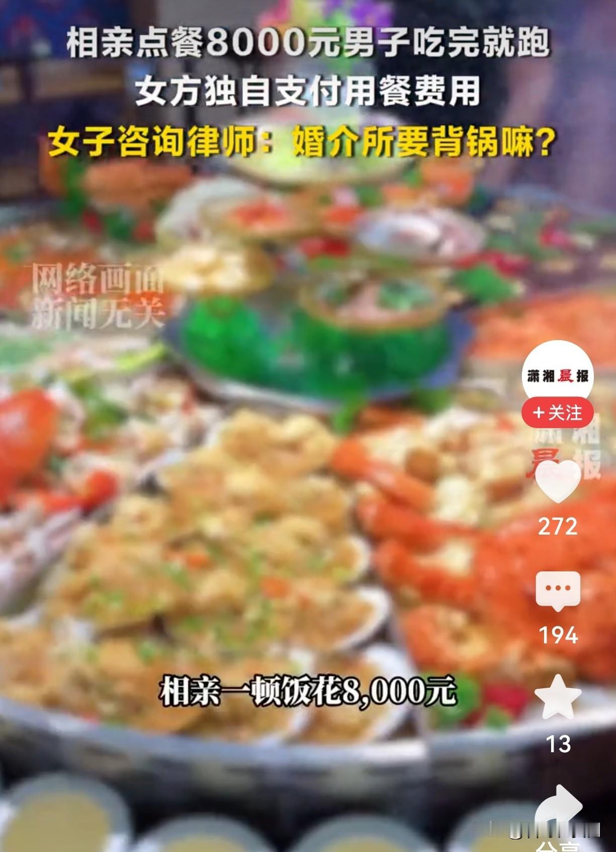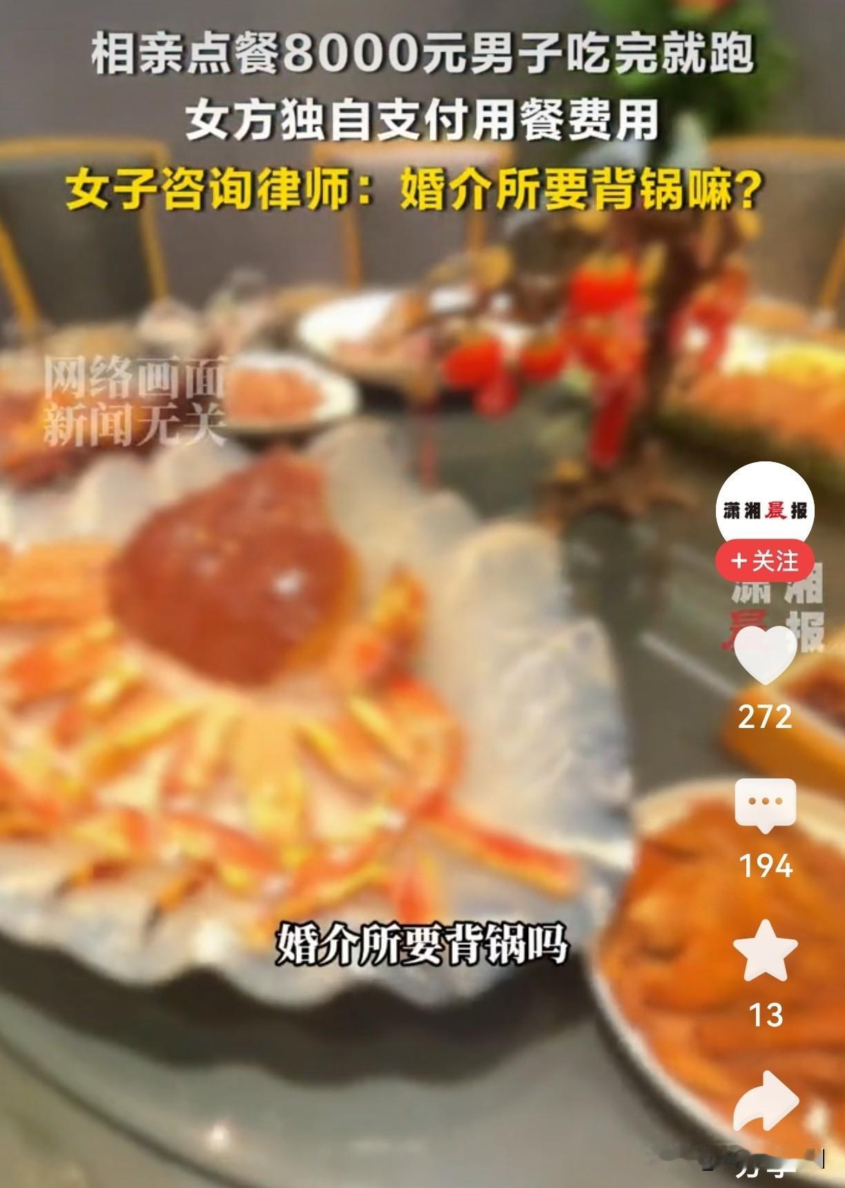 相亲男点8000元大餐竟逃单!女方怒问:婚介所不该背锅吗? 你能想象吗?一场相亲饭局,消费8000元,男方吃完居然溜了!留下女方对着天价账单傻眼——这事儿就发生在苏州。换作是你,会不会气得当场报警? 细节深挖,更让人瞠目结舌: 那天,女方怀着期待走进餐厅,男方主动点菜,专挑贵的:澳洲龙虾、顶级牛排,还开了瓶名贵红酒。女方原本以为对方诚意满满,谁料饭刚吃完,男方借口“出去接个电话”,一去不回!服务员递上账单:整整8000块。女方愣在原地,电话再也打不通。 争议来了——婚介所该负责吗? 很多人说:婚介所收钱介绍对象,不该把关人品吗?这种“吃饭逃单男”都能推荐,是不是太不靠谱了?但也有网友反驳:相亲消费是个人自愿,婚介所又不是“保姆”,哪管得了对方逃不逃单? 律师关键分析,一句话点醒局中人: 法律上,婚介所除非合同写明“对相亲消费负责”,否则无需赔钱。但!逃单男子涉嫌欺诈,女方完全可以报警或起诉追回餐费。婚介所若明知此人信用极差仍推荐,可能承担补充责任——但这得靠证据说话。 这事表面是“逃单”,深层却是相亲市场的信任危机。当相亲变成一场“价格展示”,当诚意用一顿天价大餐来衡量,到底相的是人,还是那顿饭菜?更讽刺的是,女方事后第一反应不是报警抓男方,而是追问婚介所的责任——是不是我们也习惯了,出事总想找个“第三方”来背锅? 你觉得这8000元,婚介所该不该一起担责?如果你是当事人,会先报警还是先找婚介所理论?评论区聊聊你的看法,点赞转发,让更多相亲中人避坑! 相亲那些事儿 天价账单谁买单 婚介所责任边界