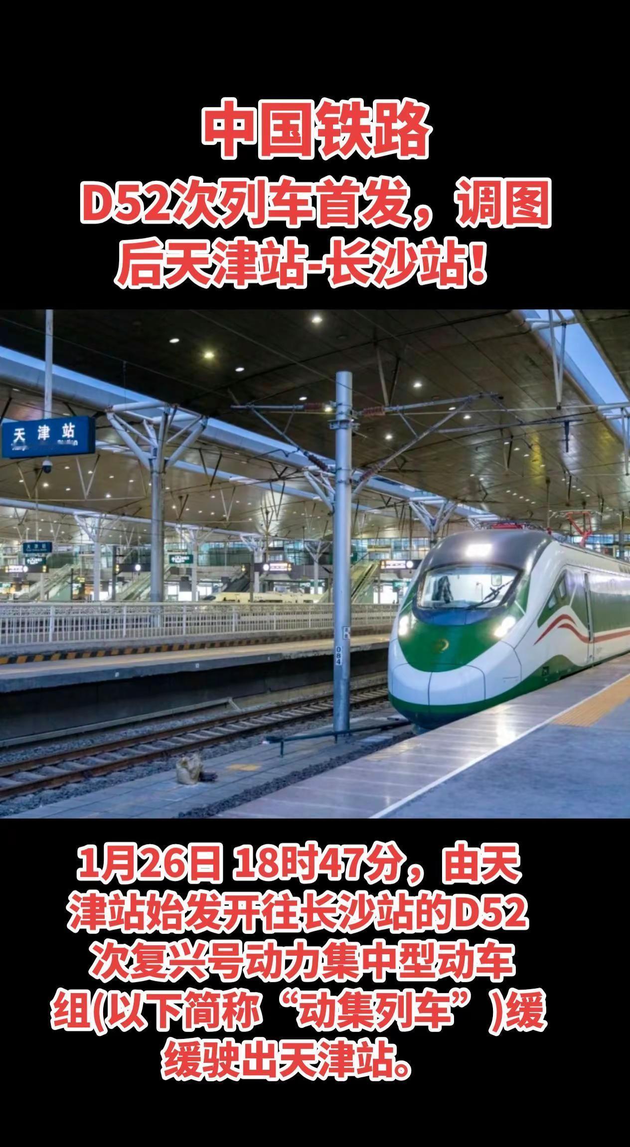中国铁路。1月26日 18时47分,由天津站始发开往长沙站的D52 次复兴号动力集中型动车组(以下简称“动集列车”)缓缓驶出天津站。新闻来源:北京局集团有限公司融媒体中心