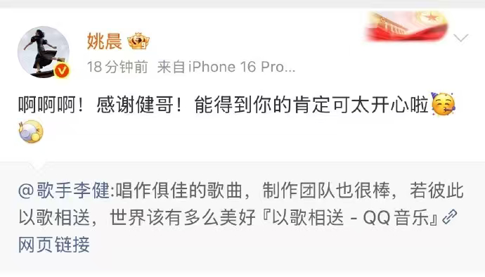 李健给姚晨新歌打call 李健给姚晨新歌打call,姚晨全新单曲《以歌相送》上线之后,音乐诗人的盖章认可加宣传,这对友谊的含金量还在上升啊,大姚温柔的声线故事感已经拉满了呀,对大姚新歌已经单曲循环安排上!