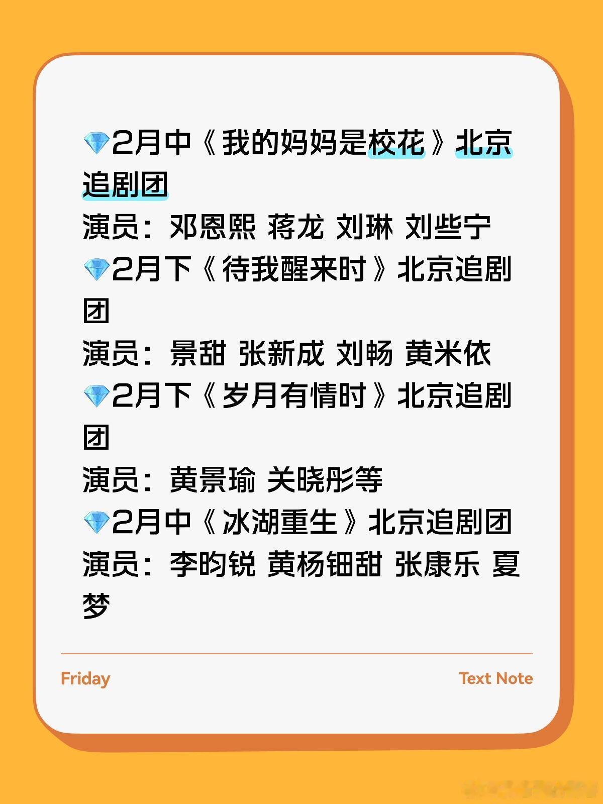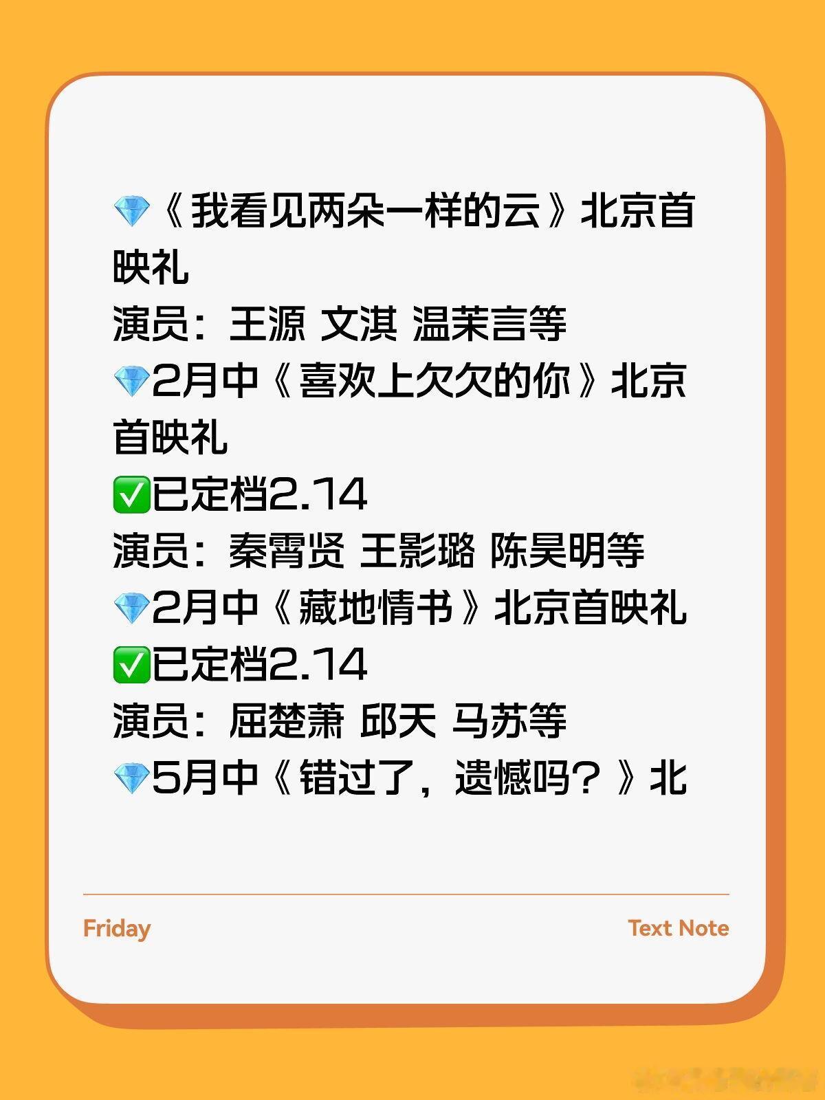 💎2月中《我的妈妈是校花》北京追剧团演员:邓恩熙 蒋龙 刘琳 刘些宁💎2月下《待我醒来时》北京追剧团演员:景甜 张新成 刘畅 黄米依💎2月下《岁月有情时》北京追剧团演员:黄景瑜 关晓彤等💎2月中《冰湖重生》北京追剧团演员:李昀锐 黄杨钿甜 张康乐 夏梦💎《我看见两朵一样的云》北京首映礼演员:王源 文淇 温茉言等💎2月中《喜欢上欠欠的你》北京首映礼✅已定档2.14演员:秦霄贤 王影璐 陈昊明等💎2月中《藏地情书》北京首映礼✅已定档2.14演员:屈楚萧 邱天 马苏等💎5月中《错过了,遗憾吗?》北京首映礼✅已定档5.20演员:庄达菲 王安宇 白客等💎2.22《纯真年代的爱情》北京追剧团演员:陈飞宇 孙千 郭晓婷等💎2.25《江湖夜雨十年灯》北京追剧团演员:周翊然 包上恩等💎《四渡》北京首映礼艺人:刘烨 王雷 王志飞 于适等