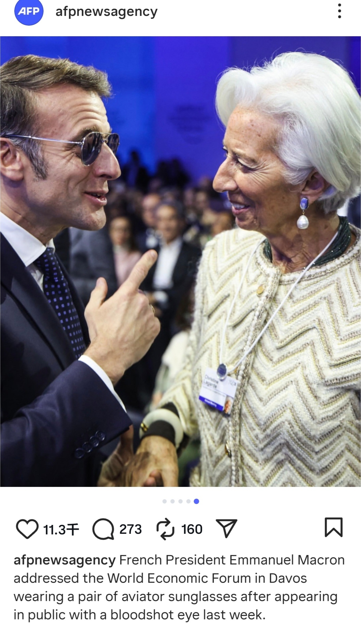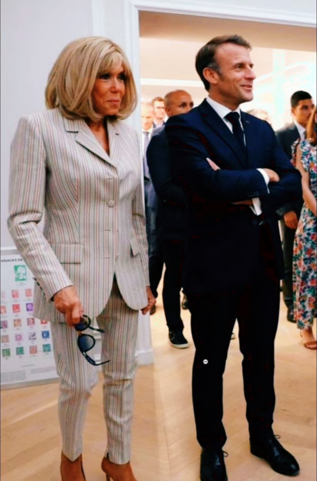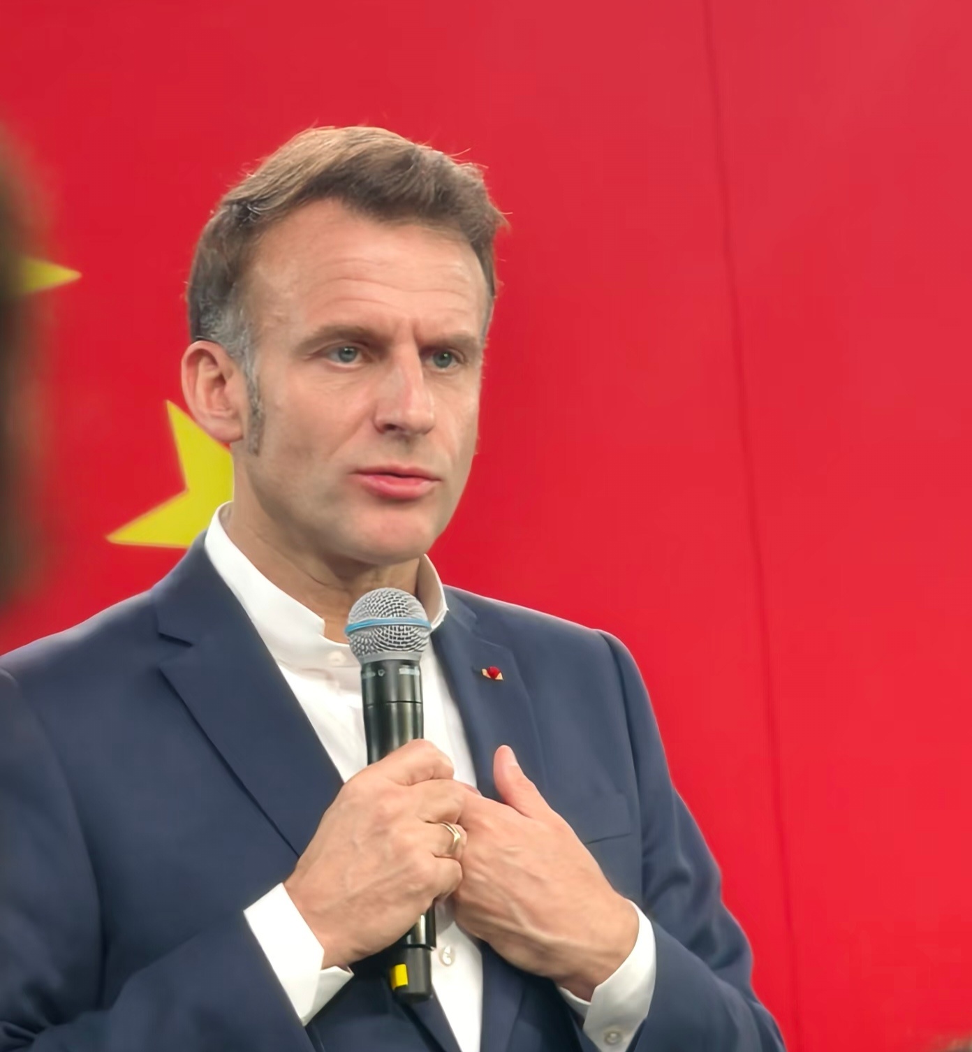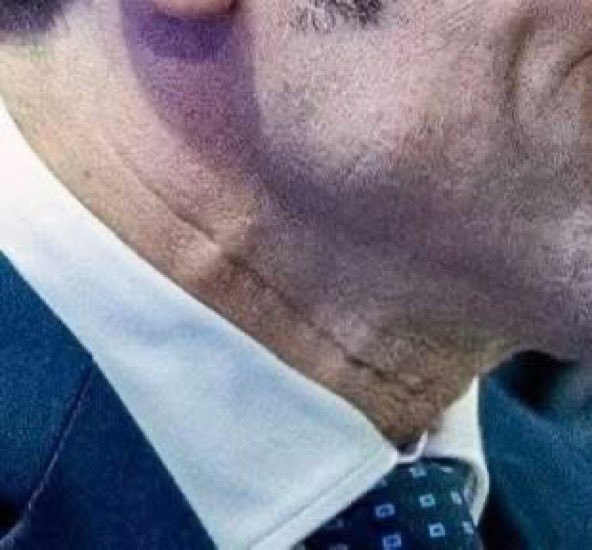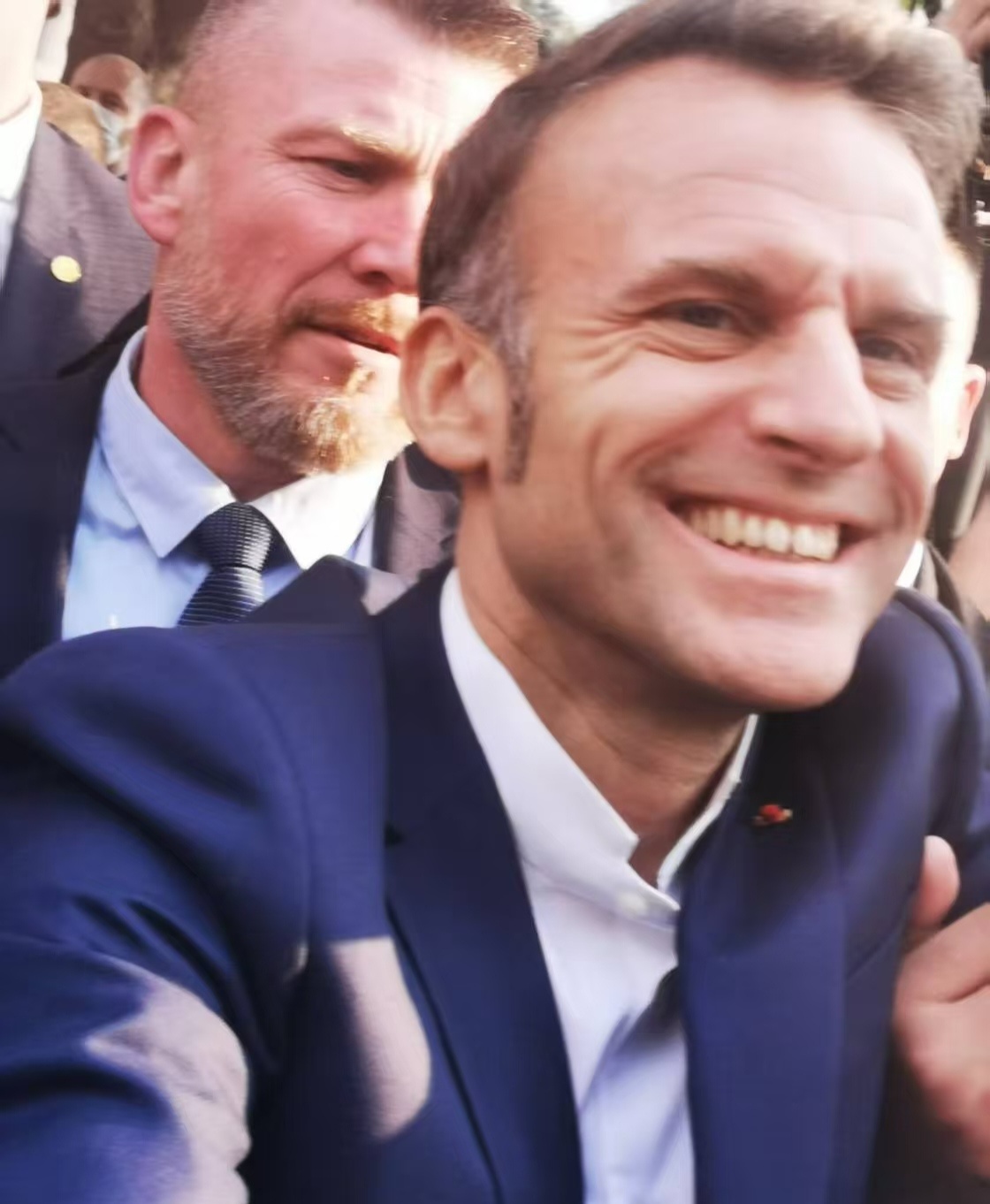 老外热议马克龙这张照片,说他脖子那里的褶皱像面具拼接处一样。