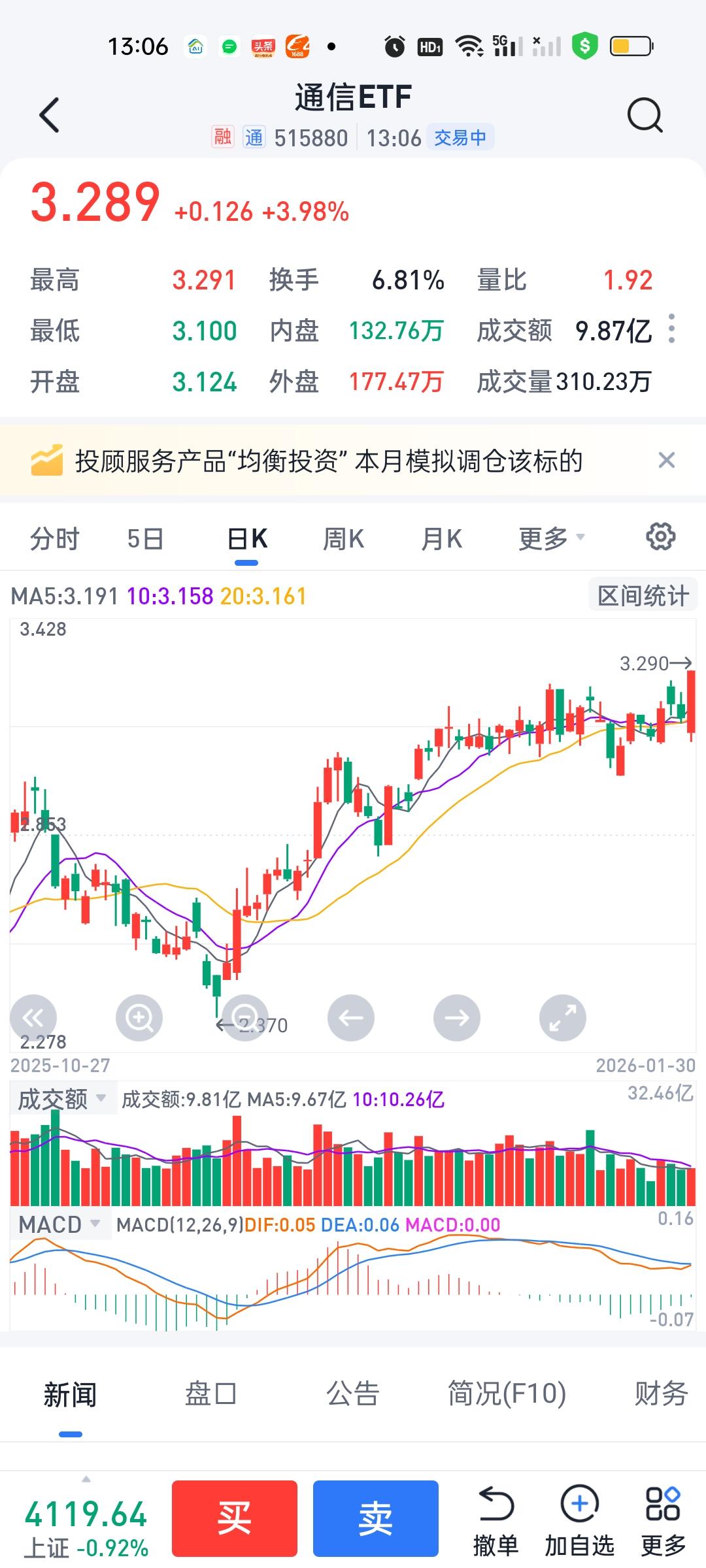 通信ETF短时间内拉直线,涨势太猛了,其实并不是好事情。一会极大概率要回调了,我自己的话会在跌50个点的地方设置第一道防线等着。也就是3.241,第二道防线我可能会设置3.191。总之两道防线不要离得太近,防止一击就破,溃不成军。