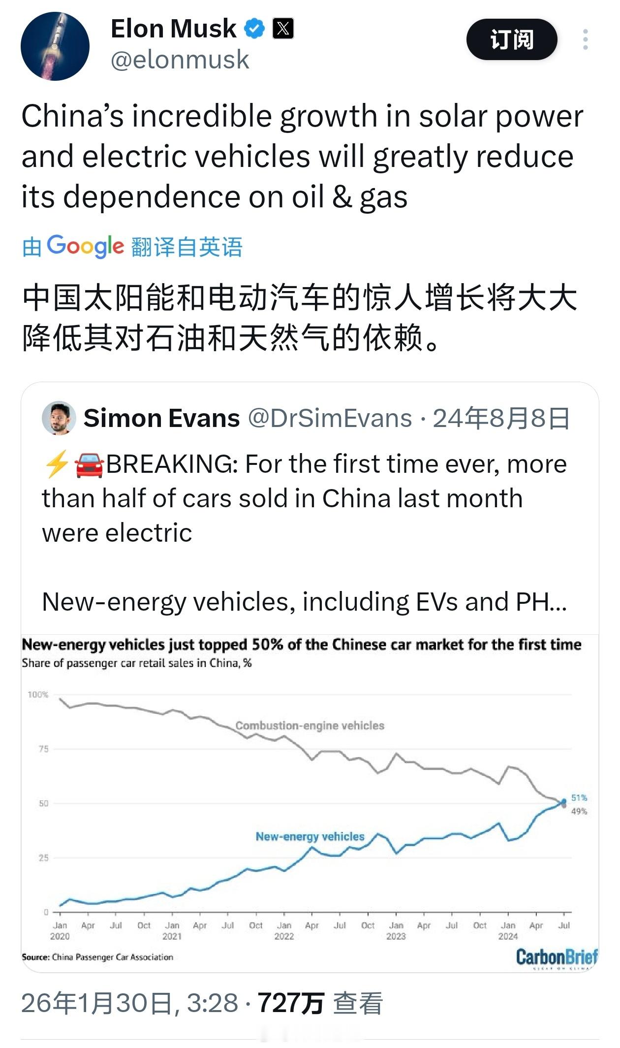 马斯克转发了一条 2024 年 8 月的推文,有点意思:中国太阳能和电动汽车的惊人增长将大大降低其对石油和天然气的依赖。