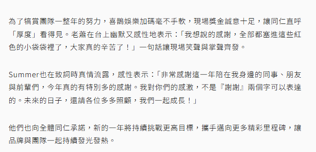【萧敬腾夫妇尾牙宴撒7位数红包】萧敬腾夫妇给团队发七位数奖金别人家系列+1~据联合报,萧敬腾Summer夫妻领军的喜鹊娱乐,26 日夜晚举行尾牙宴。为了犒赏团队一整年的努力,现场豪气抛出高达7位数奖金,萧敬腾现场表示:“我想说的感谢,全部都塞进这些红色的小袋袋里了,大家真的辛苦了!”