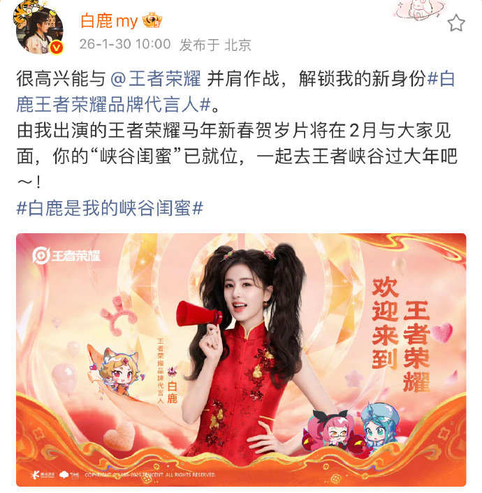 白鹿官宣王者荣耀白鹿官宣王者荣耀代言人,“峡谷闺蜜”已就位,一起去王者峡谷过大年吧~!