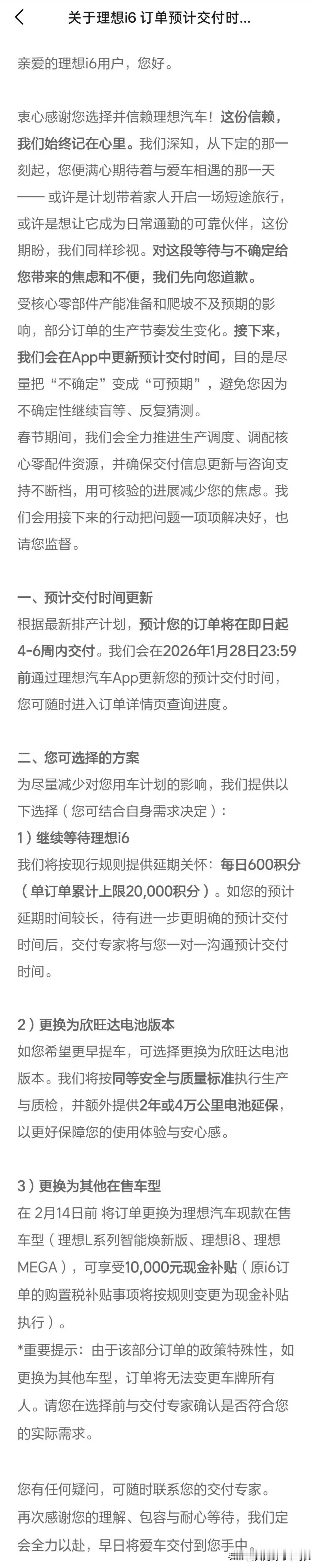 理想i6的交付时间又要推迟,理由让人难以接受,浪费了本来是要爆款的这款车。 这次官方解释的原因是:关键零部件的产能准备与爬坡进度未达预期。说白了,主要是宁德时代的电池供应跟不上。 针对这种情况,官方提供了三种应对方案: 1. 领取积分继续等待,最高可获2万积分,相当于约2000元; 2. 更换为欣旺达电池版本; 3. 更换其他车型,可获得1万元现金补偿。若原先享有购置税补贴,将转为现金形式发放。 如果让我来选,我会优先考虑第二个方案——早提车早体验。在我看来,i6依然是同价位区间里性价比最突出的车型。 我自己已经开了两个多月,期间也试驾过多款其他车型,但无论是细节做工、整体质感,还是系统响应速度,i6的表现都更胜一筹。 如果预算允许,强烈建议加预算上i8!尤其是后排经常坐人的话,把i8当作四座车来用,体验简直大幅提升~ 如果是你,会怎么选择呢?
