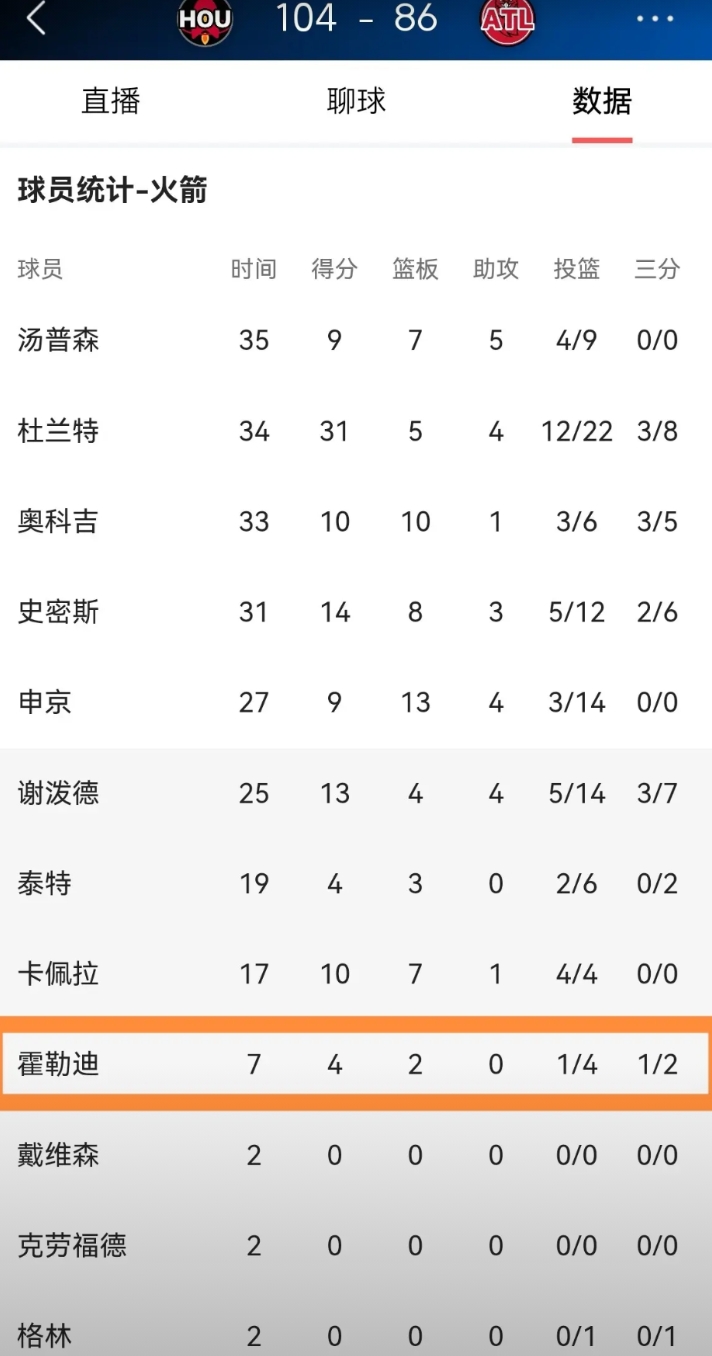 火箭悍将霍勒迪真是给机会不中用啊!在今天火箭客场以104:86击败老鹰的比赛中,