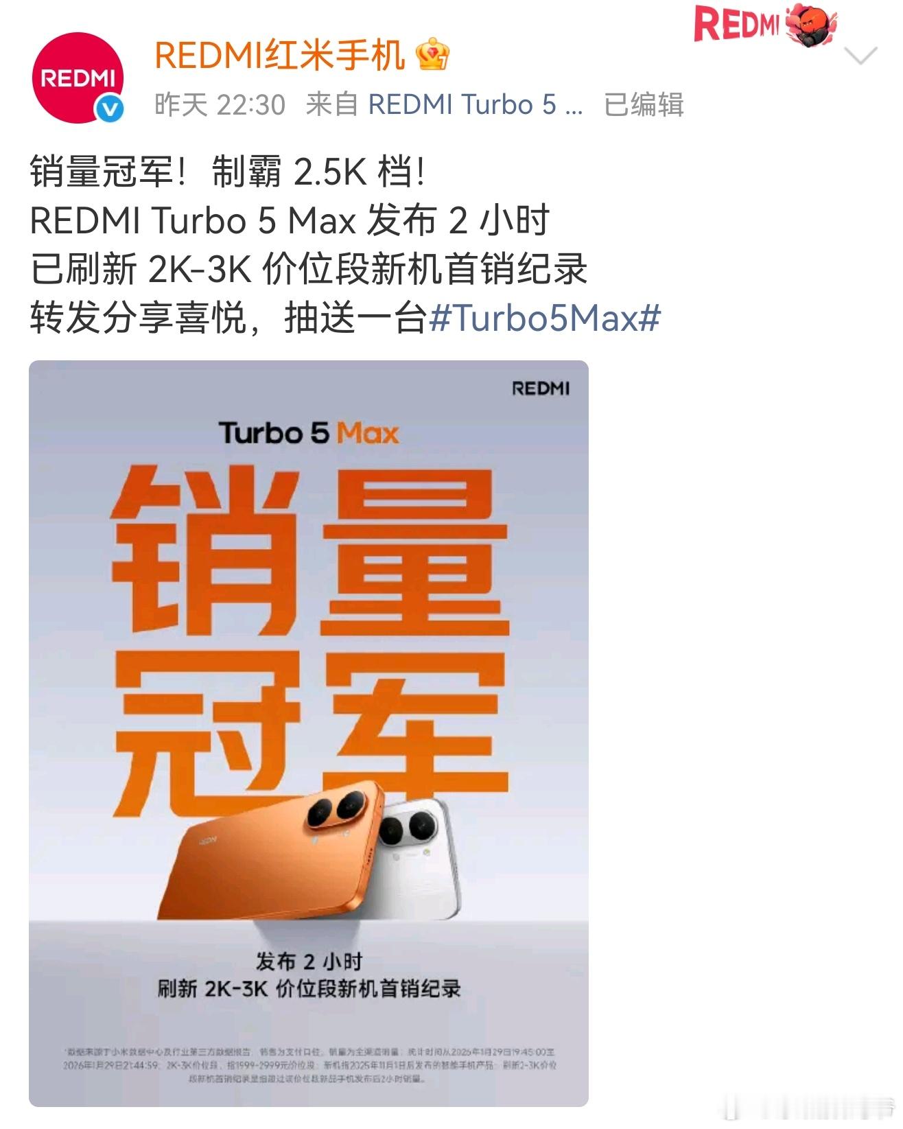 小米REDMI红米手机官方微博宣布,REDMI Turbo 5 Max 发布 2 小时已刷新 2K-3K 价位段新机首销纪录,成为销量冠军。