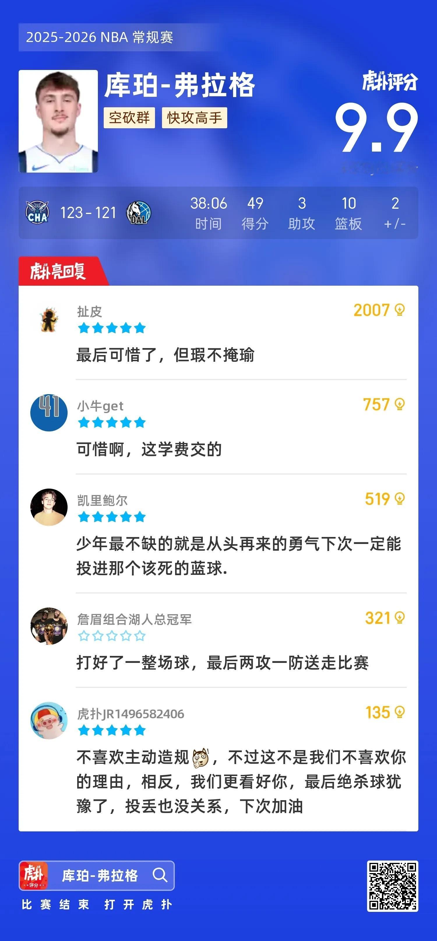 本场比赛,独行侠球员弗拉格出战38分钟,29投20中,其中三分球5投3中,罚球6投6中,得到49分10篮板3助攻1封盖。