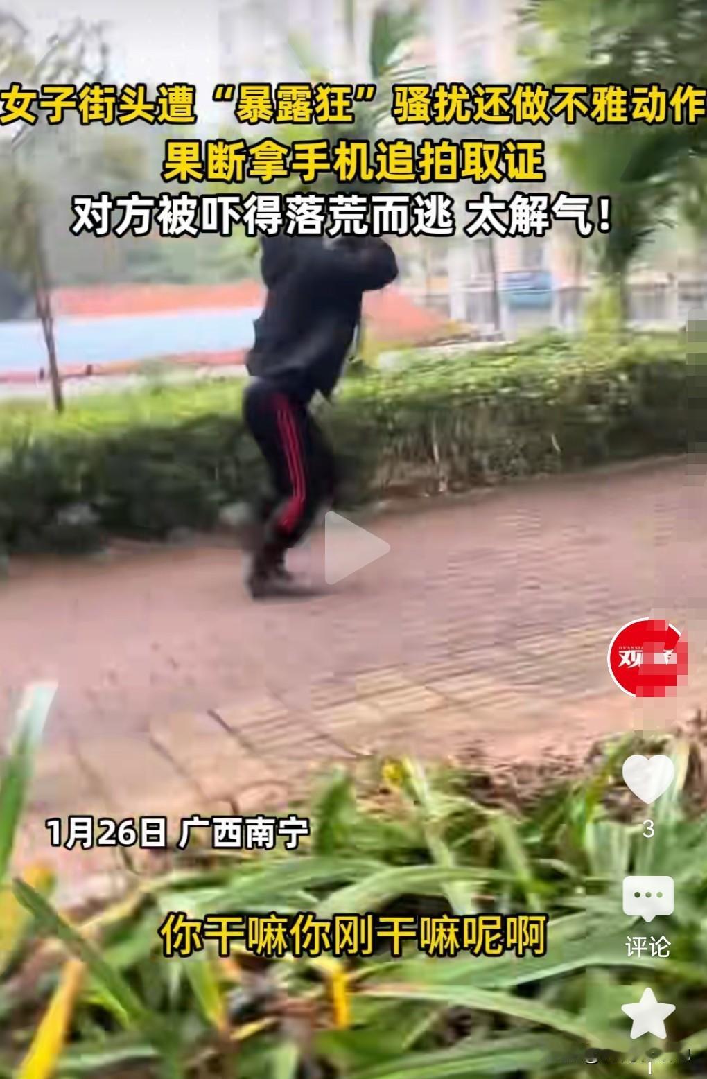 真是搞不懂那些暴露狂的心理,动不动就裸露下体。 近日广西,女子街头遭暴露狂骚扰还做不雅动作,女子非常的生气,用手机拍摄男子并大声质问。 女子边拍边说要报警。男子被吓得落荒而逃。 希望警方能够抓住这名男子,一定要让他长长记性。