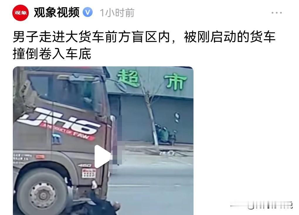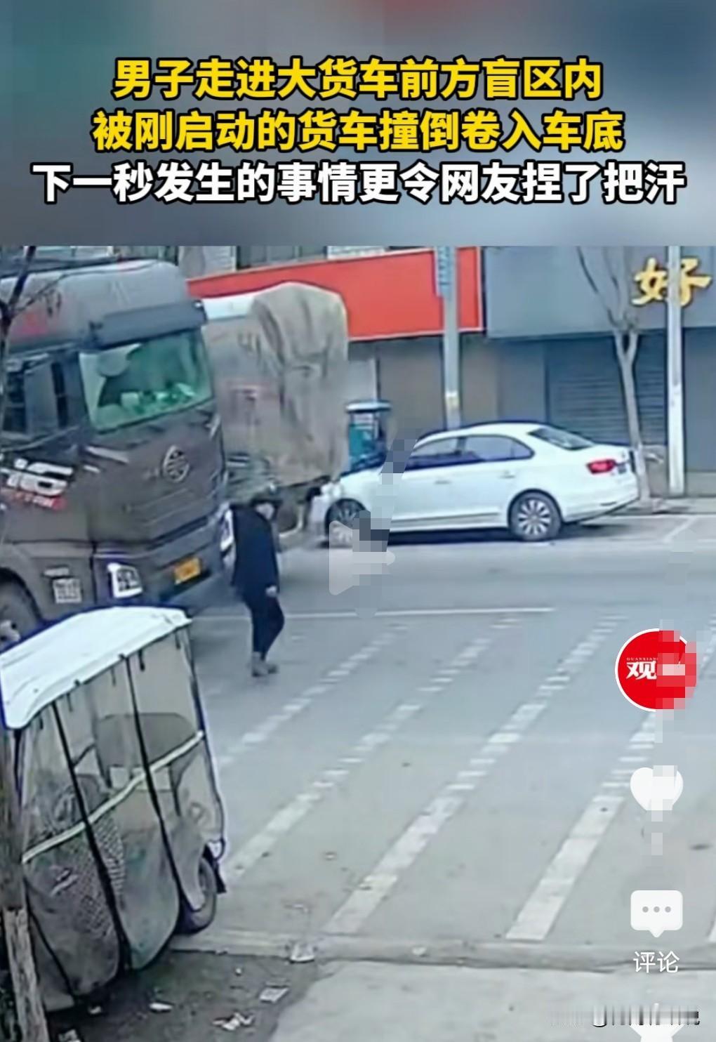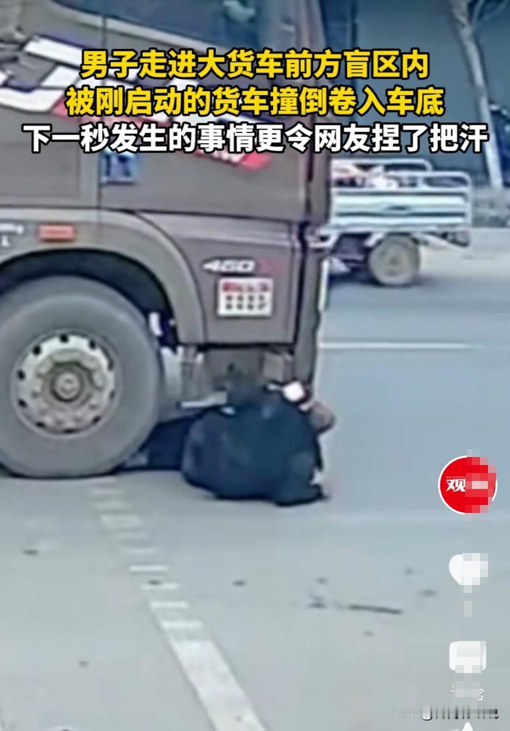有些人走路不看车况的,他不管周围的环境是怎样,自顾自的走路。 1月29日,一男子过马路没注意后方,走进了大货车前方的盲区内,被刚启动的大货车卷入车底。 大货车好像感觉到了什么,停了下来。 正当男子准备爬出来的时候。 没想到货车司机又开始启动了。 这时候幸亏旁边有人大喊,货车又停了下来。 这真是太惊险了。