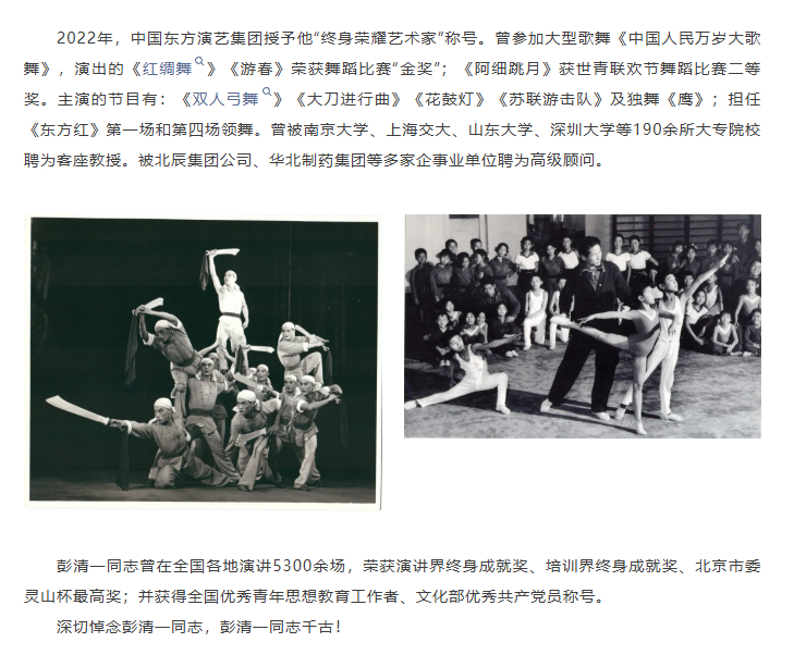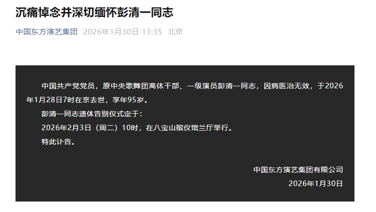 【彭清一去世】东方红领舞彭清一去世据中国东方演艺集团,中国共产党党员,原中央歌舞团离休干部、一级演员彭清一同志,因病医治无效,于2026年1月28日7时在京去世,享年95岁。遗体告别仪式定于2026年2月3日(周二)10时,在八宝山殡仪馆兰厅举行。彭清一1931年出生,1952年进入中央歌舞团,先后担任舞蹈演员、教员、编导,1992年离休。享受国务院政府特贴人员。