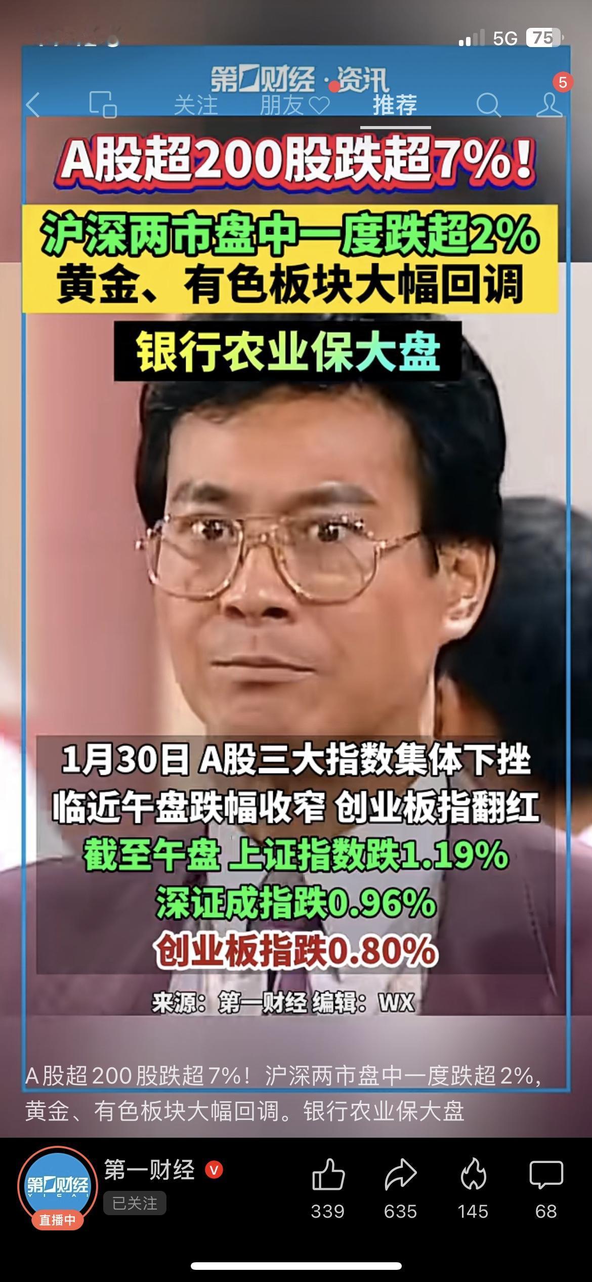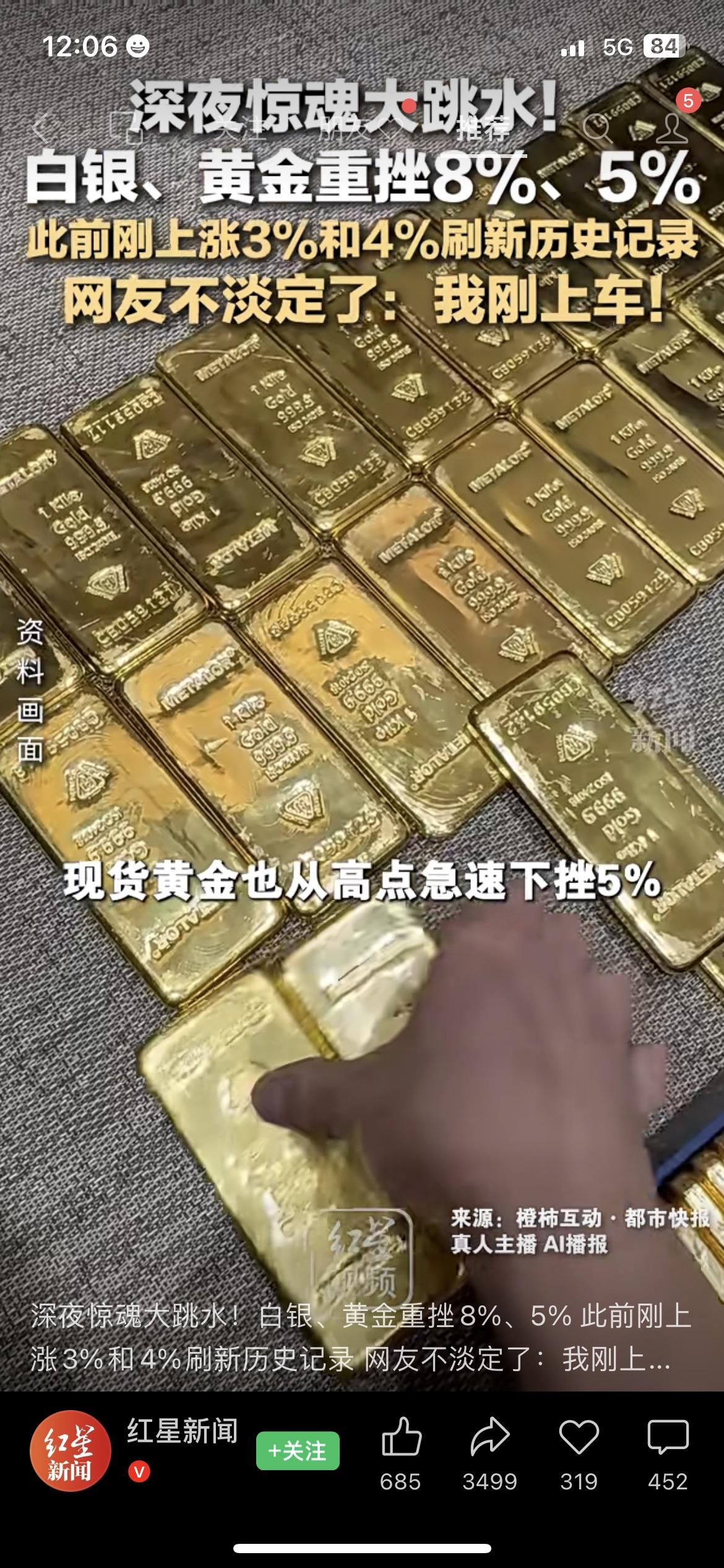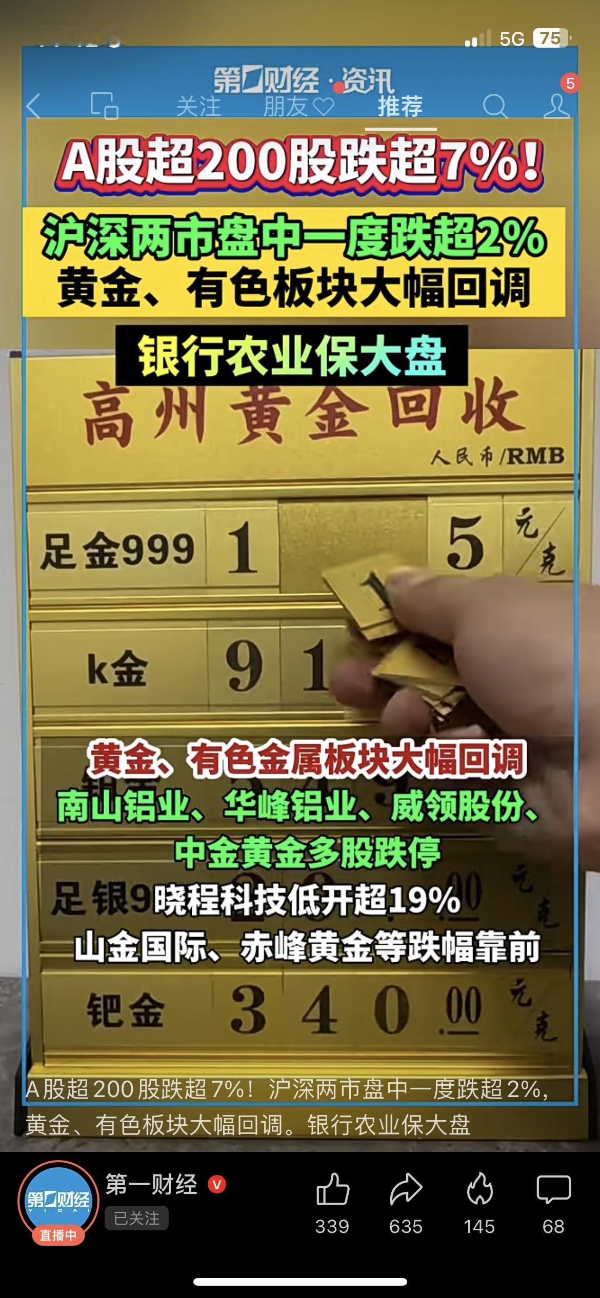 💥黄金暴跌5%!A股200股跌超7%! 昨晚黄金白银刚创历史新高,今天直接高台跳水,黄金跌5%、白银跌8%,A股跟着躺枪,黄金有色板块集体崩了,连南山铝业、中金黄金都跌停了。我身边买了黄金ETF的朋友直接蹲在工位上叹气,刚上车就被埋。 追高的快乐只有1分钟,套牢的痛苦却可能持续1个月。 你会趁跌加仓黄金ETF,还是等反弹再跑? 黄金理财 A股 财经热点 基金 市场有风险,投资需谨慎黄金白银价格
