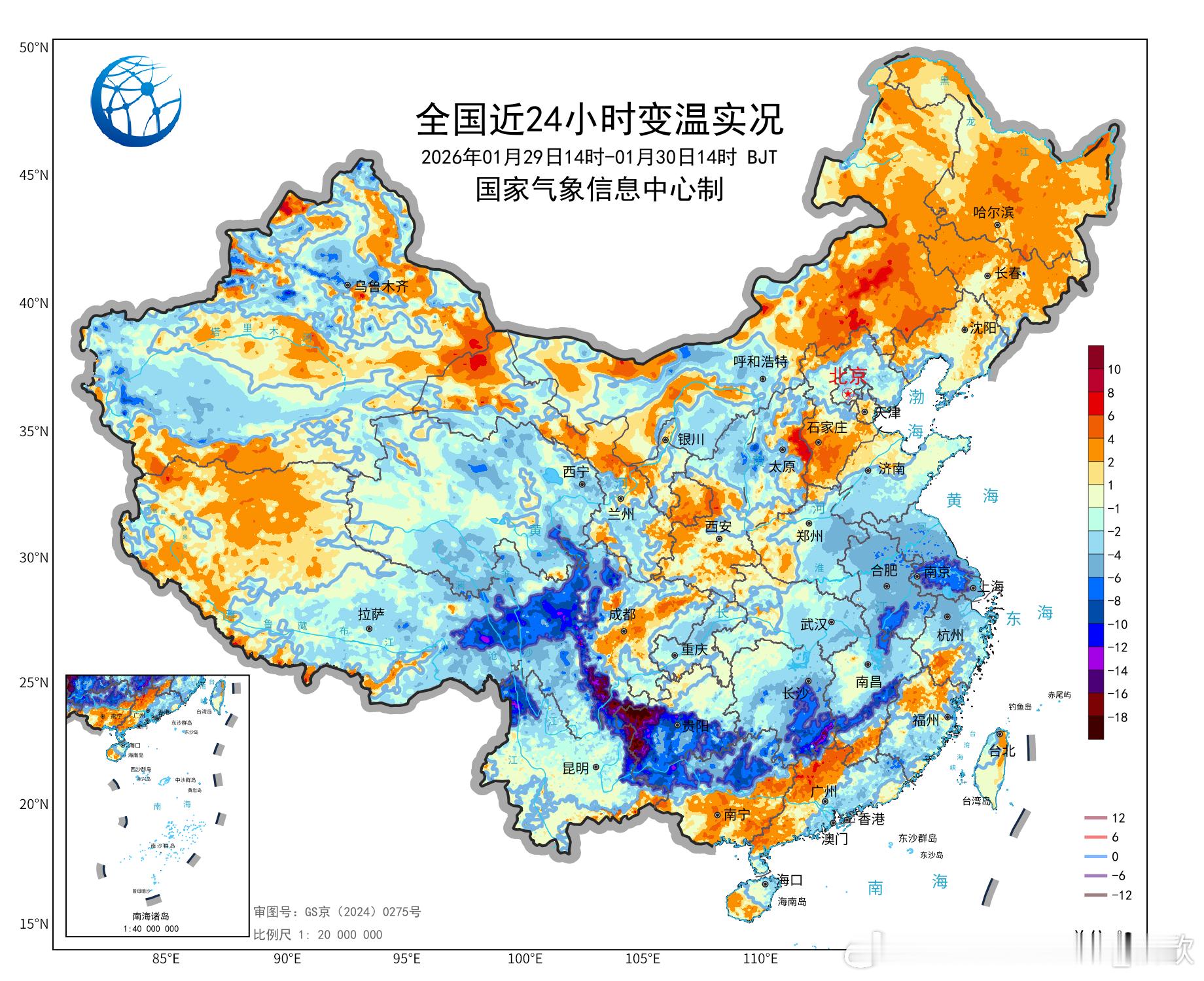 【降温】今天下午,在贵州西部、云南东北部、四川南部一带,成为降温最强区域。对比云图,今天冷空气推动准静止锋向西推进,没有了光照加热,而且还有冷空气注入,因此气温出现了10-20℃的剧烈下降。贵州赫章降20℃、云南镇雄降17℃、四川昭觉降15.8℃,为14时各省降温最强站点。
