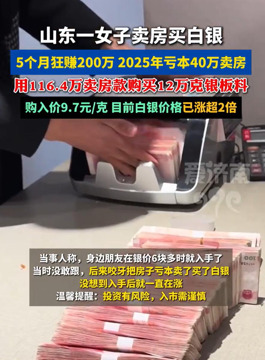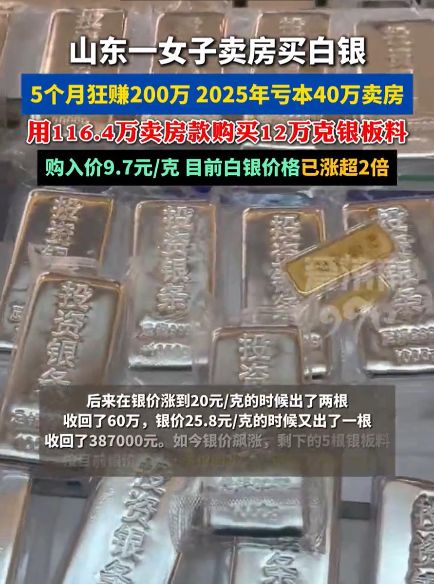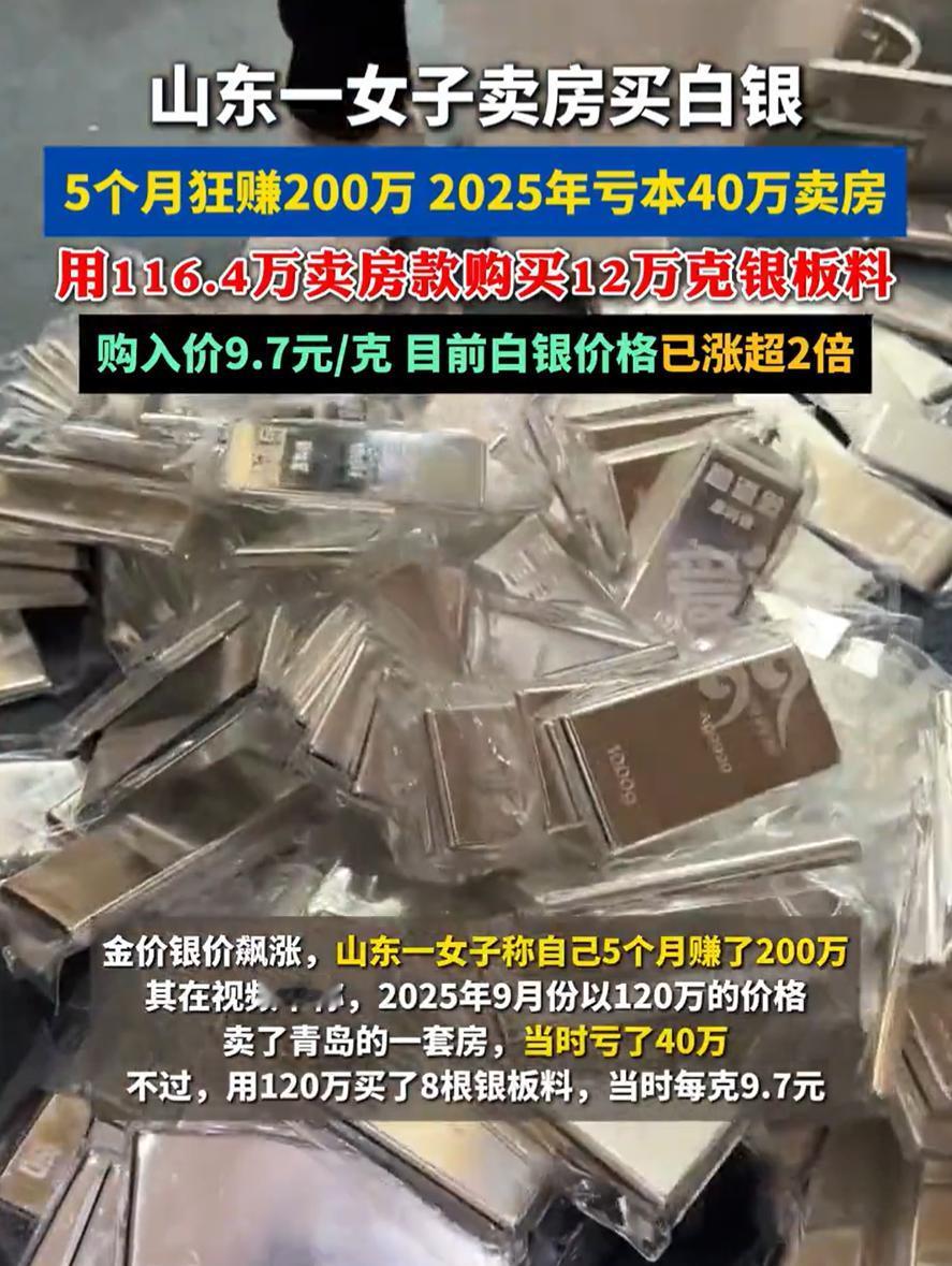 这胆子够大的!山东青岛,银价一路上涨,一女子在网上分享,她凭着投资白银,五个月赚了200万。听起来是不是有点让人眼红?但仔细看她的操作,许多人却捏了把汗 原来,她的本金来源是卖掉了青岛的一套房子。更关键的是,那套房卖得并不划算,要比正常的市场价低了40万,最后到手120万。用她的话说,当时是破釜沉舟,咬牙做的决定 去年九月,她拿着这笔钱,以每克9.7元的价格买进了8根银板料,总共12万克,花了差不多116万。之后银价开始爬升,她在20元每克时卖了两根,收回60万;到25.8元时又出了一根,再拿回38.7万。如今银价已经涨到高位,剩下的五根银板料市值早已翻了几番,算下来不仅填平了卖房的亏损,还净赚超过200万 她说,身边有朋友在银价六块多时就入手了,可惜自己当时没跟上。后来眼看着行情起来,心一横,哪怕亏本卖房也要进场。没想到这一把,真被她押中了 从结果看,这确实是一次成功的投机。但说实话,这种做法我并不赞同 投资有时候像走钢丝,尤其是在动用房产这样的大资产时。她卖房本身已经亏损40万,这意味着她的起点压力巨大,如果白银价格没有如期上涨,甚至出现回调,她的心理压力和实际损失都会成倍放大。幸运的是,这次行情站在了她这边 在我看来,投资中,运气和时机固然重要,更重要的还是风险控制。用居住房产变现去投资单一品种,本质上已经超出了常规理财的范畴,更接近一种孤注一掷的投机行为。不是每个人都能承受这样的波动,也不是每次都能遇到单边上涨的行情 这个事适合当成一个提醒。市场里从来不缺机会,缺的是活得足够久。赚到钱很重要,能承受失败更重要。不是每一次破釜沉舟,都会有人帮你兜底