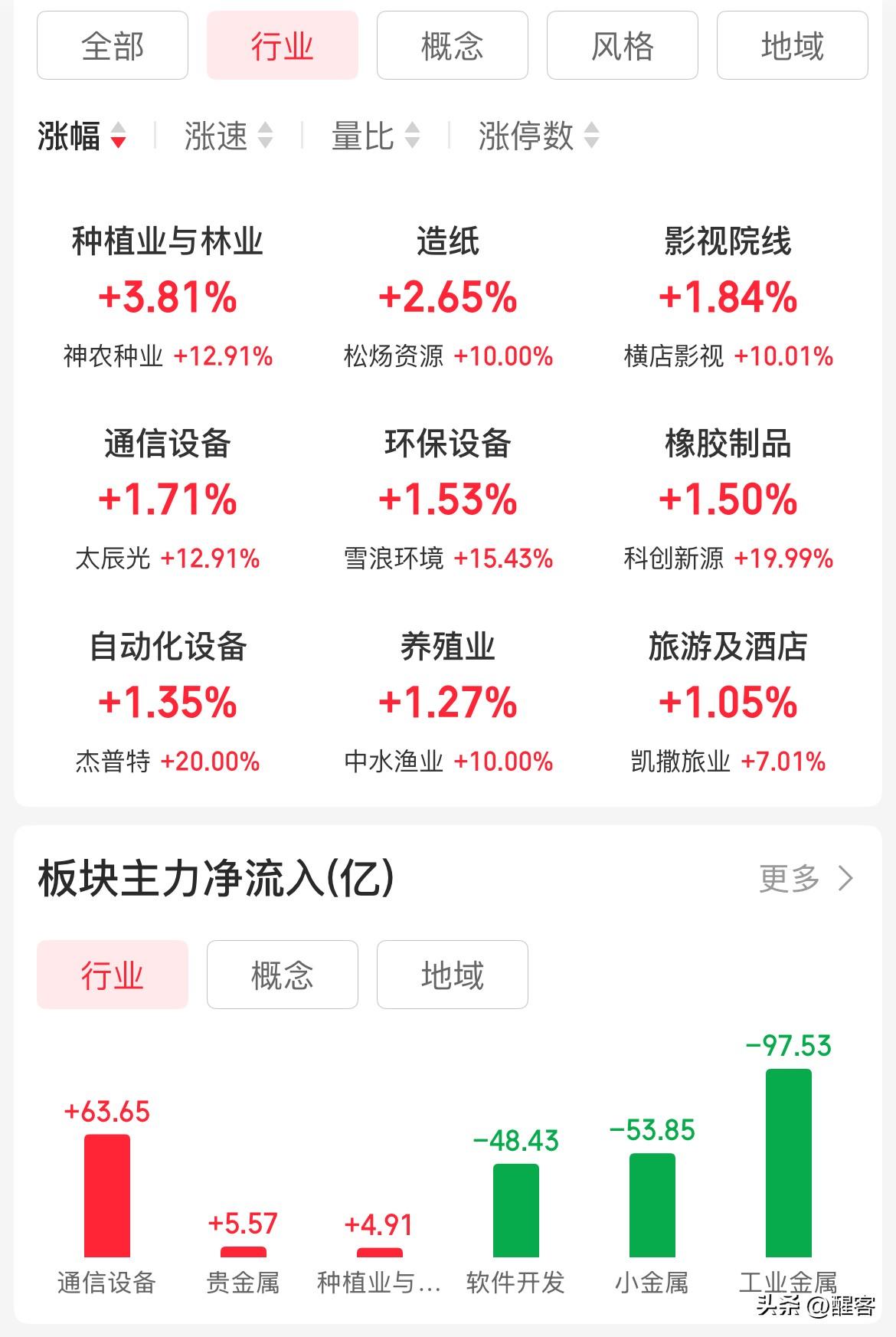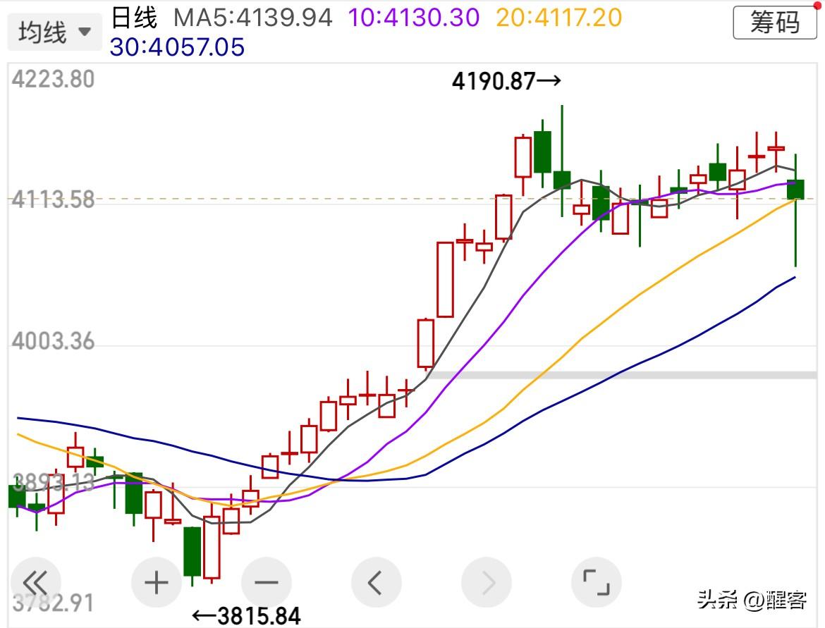 深V反弹,精准站在20日均线上,非常佩服主力的控盘。不过这根下影阴线给予了后市更多的下探空间。 板块方面,贵金属遭遇集体跌停,板块跌了9%;昨天暴涨的白酒板块跌2.73%,未能延续涨势;令人意外的是主力今天主要拉抬了通信和农业板块,这真是主力“每天拉一样,天天不重样”。 下一个板块轮到谁?