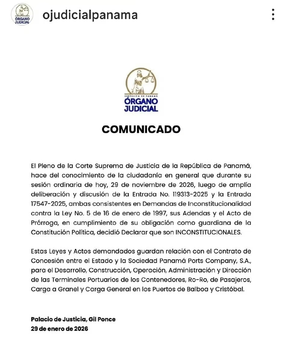 突发新闻:巴拿马最高法院于2026年1月29日周四晚(当地时间)一致裁定香港长和集团(CK Hutchison Holdings)旗下子公司巴拿马港口公司(Panama Ports Company,简称PPC)在巴拿马运河两端港口(Balboa和Cristóbal)的经营特许权违宪。