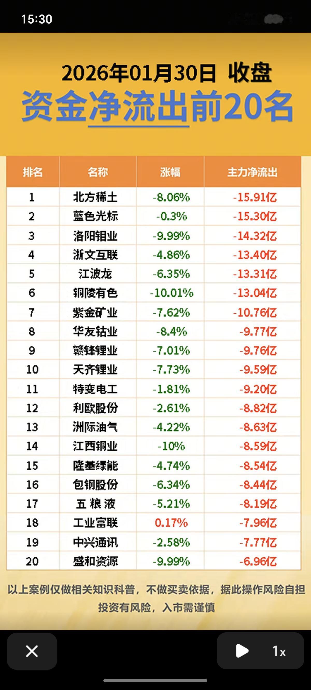 1.30周五 主力资金 抢筹出逃个股榜! 资金抢筹: 通信设备、CPO光模块、存储芯片、白色家电、半导体、农业种植养殖水产等。 资金出逃: 有色金属、贵金属、能源金属碳酸锂等