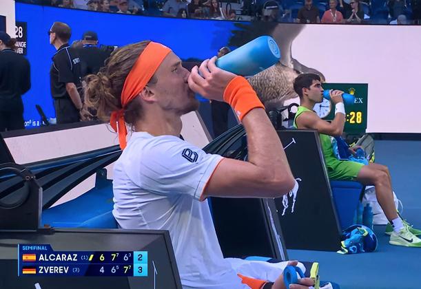 网友:看着都累,快点结束吧!! … 在正在进行的澳网男单半决赛中,由1号种子阿尔卡拉斯对阵3号种子兹维列夫,首盘阿卡6-4拿下,第二盘在2-5落后的情况下抢七逆转兹维列夫,取得大比分2-0的领先,本以为阿卡能趁机3-0拿下比赛了,谁知场上风云突变,阿卡在第三盘第9局突发大腿不适,在局分5-4领先时叫了医疗暂停,兹维列夫为此还喋喋不休,随后因脚下移动受影响,阿卡输掉了抢七,兹维列夫抢回了一盘…目前第四盘比赛正在进行中!…澳网男单赛况 兹维列夫