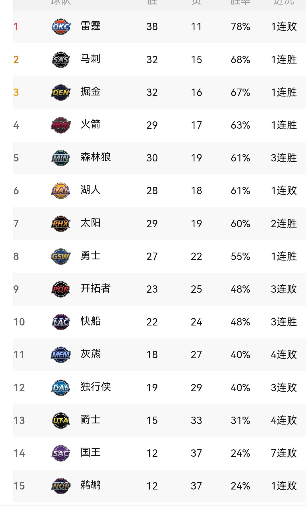 雷霆不敌森林狼,火箭负马刺,勇士胜爵士,NBA新一轮之后看西部排名 本轮NBA赛事再曝冷,雷霆客场挑战森林狼再次落败,本赛季双方三次交手,雷霆两负一胜,说话间雷霆本赛季已经11败。本场比赛,雷霆第一节结束22:34落后12分,之后全场没有翻盘的机会,最终以111:123落败。 火箭被逆转,主场不敌马刺。此役是双方本赛季的二番战,双方上一次交手火箭获胜。今日之战火箭首节依然36:26领先,而后三节被马刺逐渐追分,第四节反超以111:99获胜。 勇士客场对阵爵士。科尔采用田忌赛马战术,上一轮面对强敌,勇士几乎轮休了全部主力,而对阵爵士,勇士全主力回归,最终获得大胜。此役勇士11分得分,其中8人得分上双。 另外,独行侠背靠背连负森林狼和黄蜂,火箭背靠背另一场比赛胜老鹰、太阳胜火塞、掘金胜篮网,而湖人负骑士,灰熊负黄蜂、国王负76人。 此轮之后,西部排名前三的队伍依次为雷霆、马刺和掘金,其胜率为78~67%;排名4~6名的队伍依次为火箭、森林狼和湖人,其胜率为63~61%。 位于季后赛附加赛区内,排名第7~10的四支队伍依次为太阳、勇士、开拓者和快船,其胜率为60~48。 排名第11~15名的队伍依次为灰熊、独行侠、爵士、国王和鹈鹕,其胜率为40~24%。