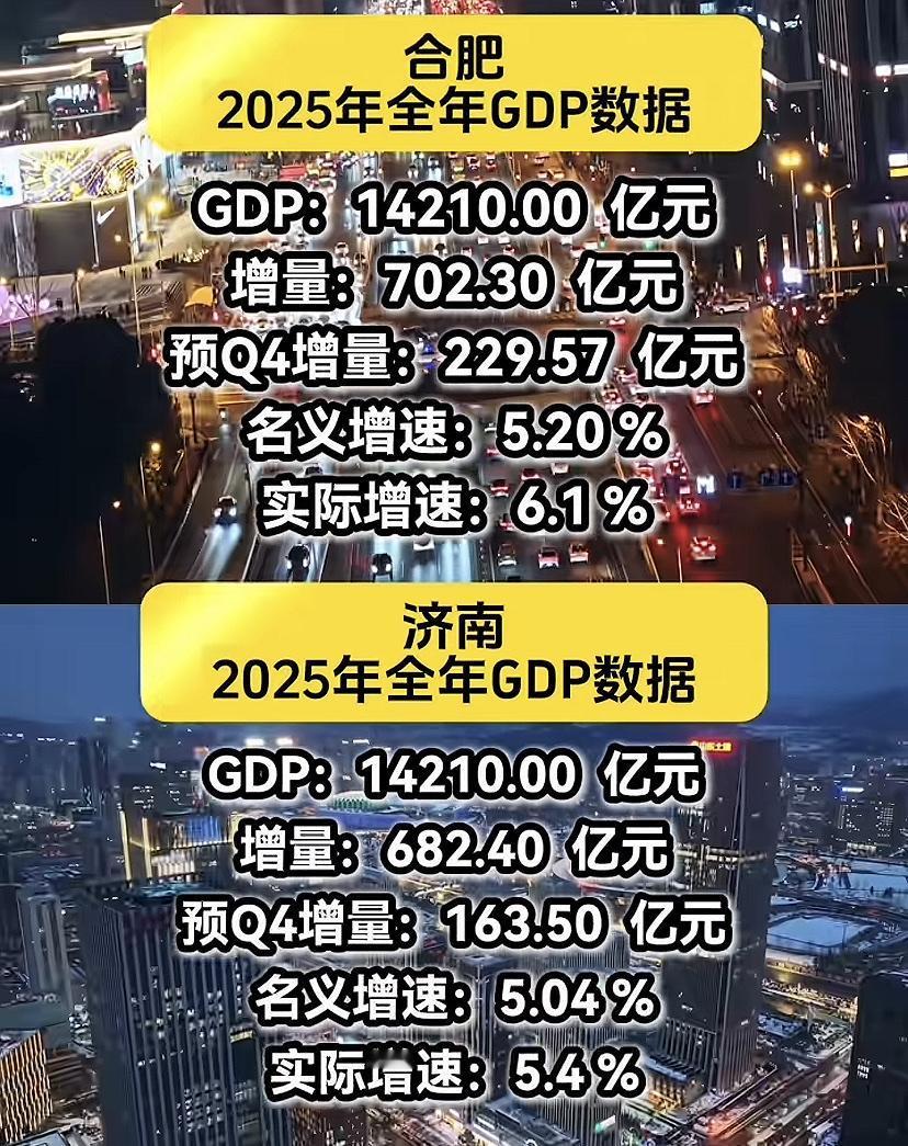 济南gdp和合肥gdp高度重叠,今年竟然都是一模一样的14,210亿! 合肥的GDP增量略微多一点,在今年终于赶上了济南,这两个省会城市的gdp现在到了一模一样的起点了,接下来的几年,不知道谁的后劲会更加的强。 放在全省的位置上来看,很显然山东的经济总量明显超过安徽一大截,而且山东沿海优势非常的大。更何况山东的经济第一大市是青岛市,安徽省除了合肥之外,就没有gdp过万亿的城市了。 各位是怎么看的?欢迎评论区留言。