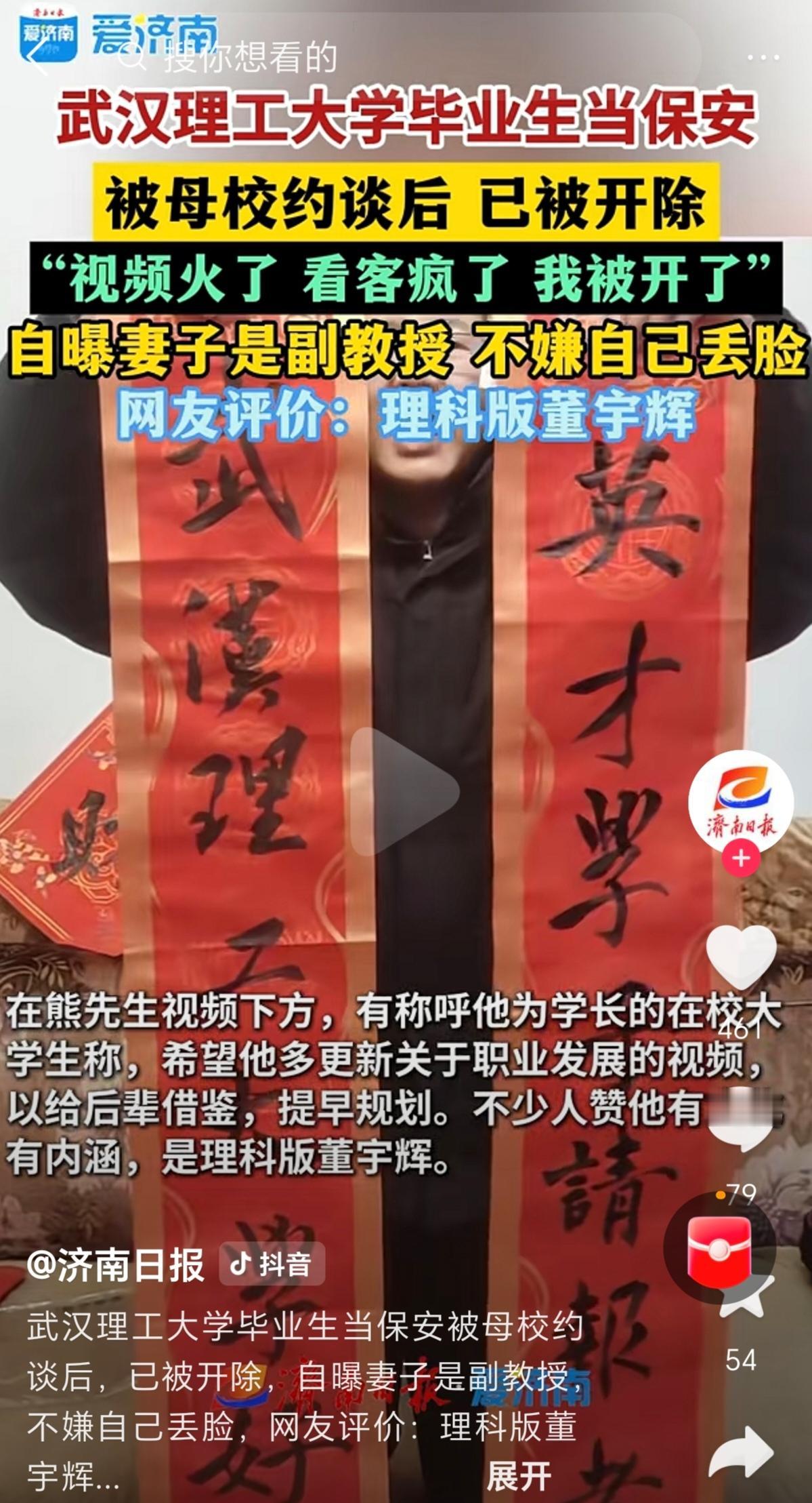 高校毕业生做保安,本身没什么问题。因为人到中年,40多岁的本科生,在经历了人生大起大落的创业之后。先通过做保安这份工作,让自己过渡一下,然后再寻找合适的事业,重新再来。这本身并没有任何问题。 主要原因,还是在于他在网络平台走红以后,网友们产生了不同的评论。面对这巨大的流量,保安公司可能也怕影响到自身公司,给公司带来不必要的压力。所以,才会劝退他! 本科生在自身事业遇到挫折的时候,选择做保安,送外卖、送快递、开网约车,过渡一段时间,挺正常的。该事件中的这位大哥,正如他自己所说的,之所以引起一些议论,以及被辞退。主要还是因为蹭了名校毕业生和保安,这两个头衔的流量。