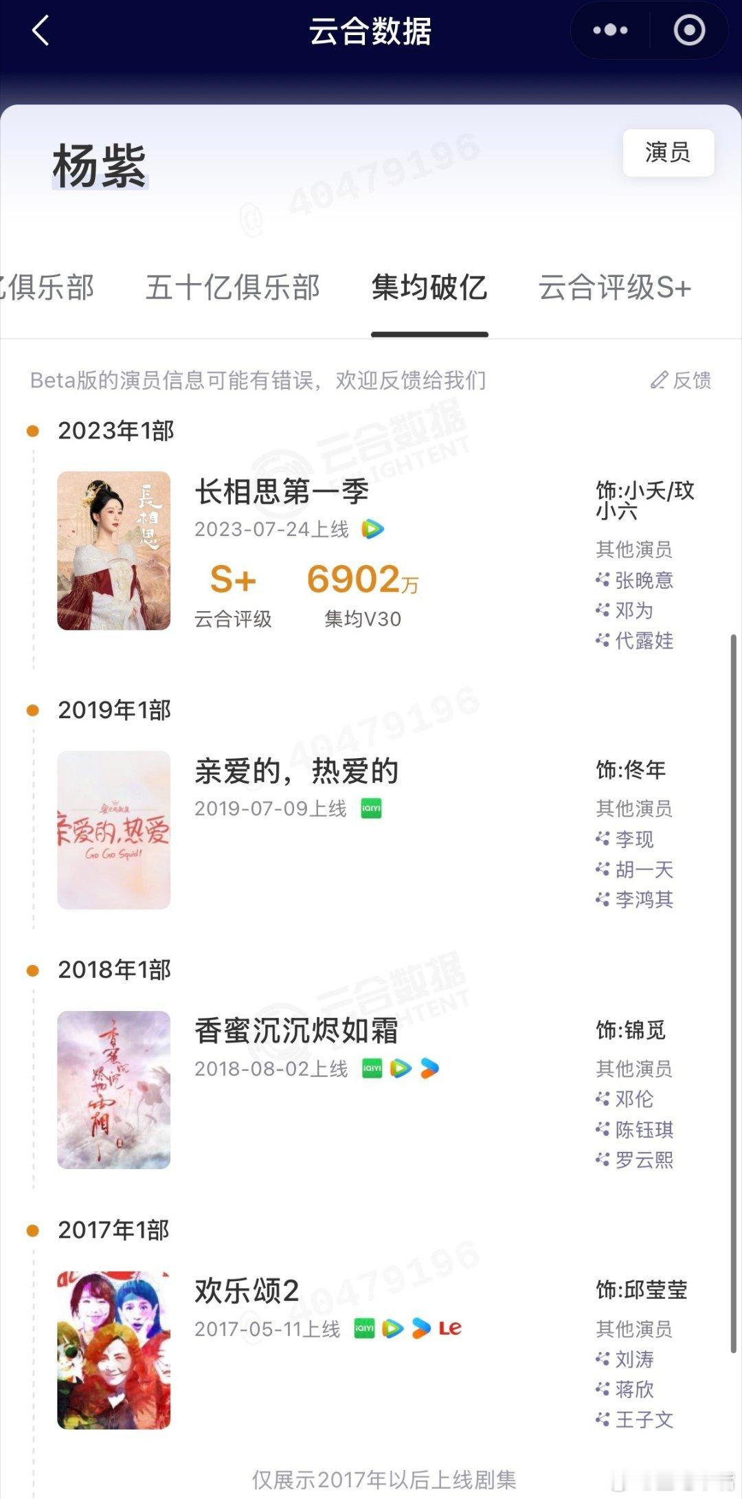 长相思第一季云合集均破亿云合战报!杨紫《长相思第一季》有效播放集均破亿! 至此杨紫四部作品云合集均破亿,分别是:2023年长相思第一季2019年亲爱的热爱的2018年香蜜沉沉烬如霜2017年欢乐颂第二部
