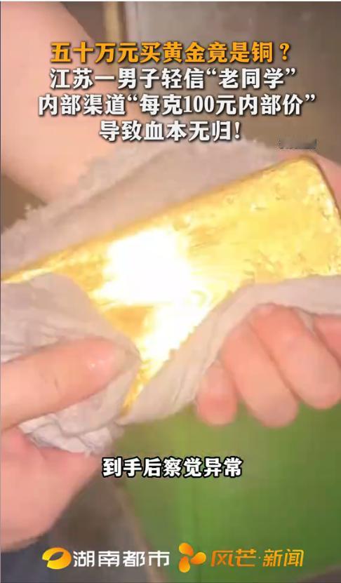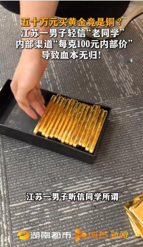 “悲剧还是发生了!”近日,江苏常州,一男子轻信大学老同学,花费近50万元购买了所谓“内部渠道的金条”,而每克仅需100元,结果到手后没多久,就发现金条色泽异常、声音沉闷,拿去鉴定后竟88%都是铜!网友:贪小便宜吃大亏! 近日,江苏常州一名男子的遭遇,给所有想贪便宜的人上了沉重一课。他轻信大学老同学的话,花近50万元入手所谓“内部渠道金条”,每克仅售100元,比市场价低十几倍,本以为捡了大漏,到手后才发现,自己从头到尾都活在骗局里。 常州的王先生(化名)和杨某是大学同学,毕业后两人虽联系不多,但始终保留着好友关系,王先生一直对这位老同学十分信任。 前段时间,杨某突然主动联系王先生,神秘地透露自己有黄金内部购买渠道,能拿到低价金条,每克只要100元,还承诺绝对是正品,转手就能赚差价。 王先生平时也关注过黄金价格,知道2026年初黄金市场价居高不下,银行投资金条每克都在1200元以上,金店售价更是逼近1700元/克,100元/克的价格堪称“天上掉馅饼”。一时被利益冲昏头脑的他,没多想就动了心,主动和杨某敲定了购买意向。 随后,王先生先后多次给杨某转账,累计花费近50万元,委托对方帮忙代购金条。期间,杨某多次以“渠道审核”“货源调配”为由拖延交货, 王先生出于对老同学的信任,一次次选择容忍,从未产生过怀疑,还满心期待着拿到金条后变现赚钱。 直到2026年元旦后,杨某终于告知王先生金条到货,两人约定在张家港交接,王先生特意喊上哥哥一起前往,满心欢喜地取回了3根金条。 可刚拿到手,王先生就觉得有些不对劲,这些金条的色泽和他印象中的黄金完全不同,不是纯正的金黄色,反而黄中带白,光泽也十分暗淡。 他试着用硬物敲击金条,听到的不是真金那种沉闷的“啪嗒”声,反而有些发闷却无质感,和铜制品的敲击声更为接近。 越想越慌的王先生,赶紧带着金条前往专业机构做鉴定,生怕自己被骗,而鉴定结果让他彻底崩溃——这些金条竟是假的,铜含量高达88%,几乎就是裹着少量黄金的铜块。 得知真相后,王先生第一时间联系杨某,可此时杨某要么敷衍搪塞,要么干脆不回消息,后来甚至直接失联。走投无路的王先生,只能选择报警,寻求警方的帮助,希望能追回自己的50万元损失。 警方接到报警后,迅速展开调查,很快将犯罪嫌疑人杨某抓获归案。面对民警的讯问,杨某如实供述了自己的诈骗行为,坦言自己根本没有所谓的黄金内部渠道, 这些假金条都是从网上低价网购来的,之所以编造谎言,就是因为自己资金周转困难,想靠这种方式骗取钱财。 据悉,目前杨某因涉嫌诈骗已被警方依法采取刑事强制措施,万幸的是,王先生被骗的近50万元款项已被全部追回,算是减少了损失。 此事传到网上后,网友们纷纷热议,有人直言“贪小便宜吃大亏”,也有人提醒,低于市场价太多的东西,大概率都是骗局。其实辨别黄金真伪可通过色泽、重量、声音等初步判断,遇到离谱低价,一定要多留个心眼。 对此,你们有什么看法,欢迎评论留言~