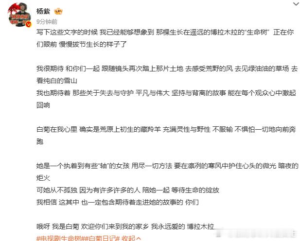 杨紫新剧开播长文杨紫长文宣传生命树开播杨紫的《生命树》开播,她发长文宣传,以白菊视角描述角色,说这个女孩像藏羚羊般执着守护心头微光