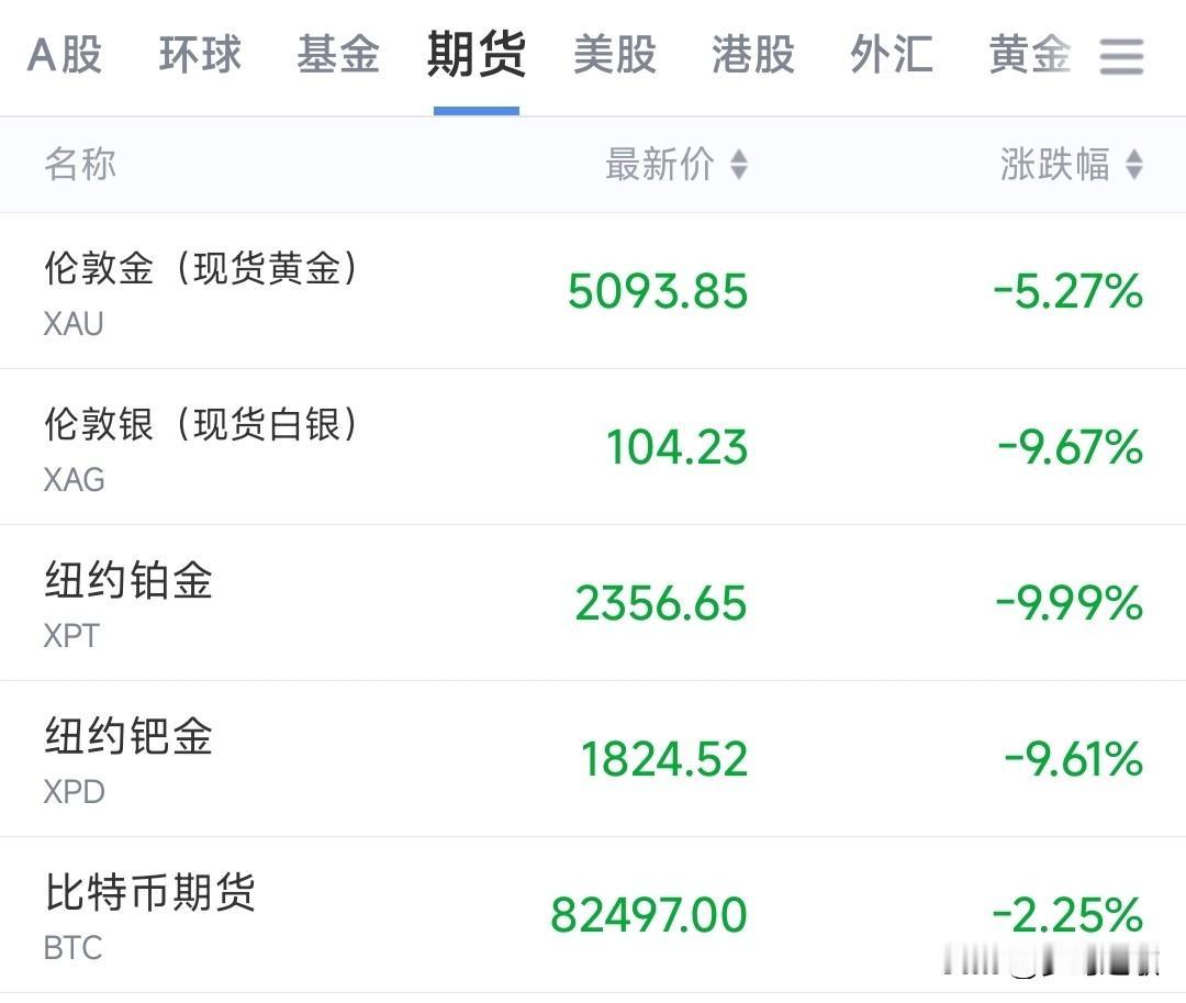 A股为什么大跌,原因在于期货这里 今天A股八上周一周的涨幅几乎都跌没了,尤其是前期涨得好的有色金属,航天军工,光伏等板块,几乎是暴跌,直接把所有板块都给拉了下来。 今天大盘下跌的原因主要就是国际贵金属闪崩造成了恐慌,目前现货黄金已经跌了超过5%,现货白银更是跌了将近10%,贵金属几乎都在暴跌。 这种暴跌就会造成买贵金属的散户形成恐慌情绪,容易引起恐慌性抛售,把所有筹码低价卖出。 目前美股盘前也在暴跌,预计美股今天也好不了,全球的资本市场都会因为期货贵金属的暴跌出现较大幅度的震荡。