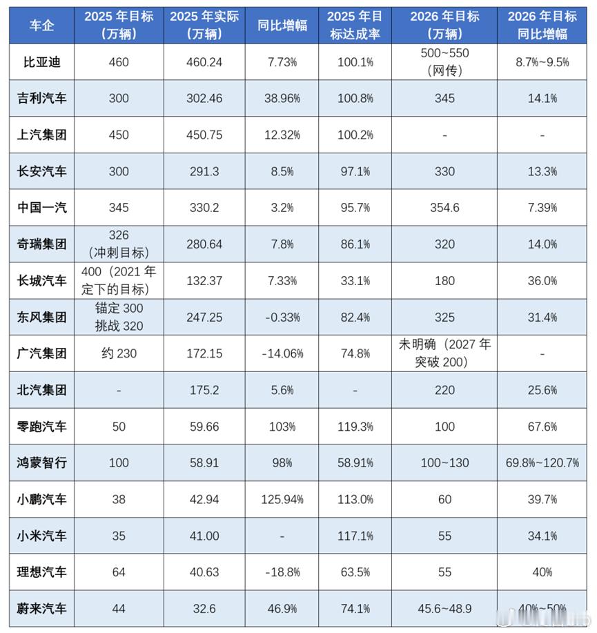 看了一份2026车企目标汇总,比亚迪要把天花板继续顶高到 550万辆,吉利也要冲 345万辆,这种体量还能这么涨,底气确实足