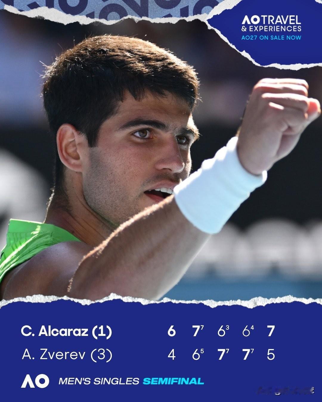 经过5个半小时5盘大战 阿卡拉斯6-4/7-6/6-7/6-7/7-5兹维列夫 首次晋级澳网决赛。 离全满贯只差一场。