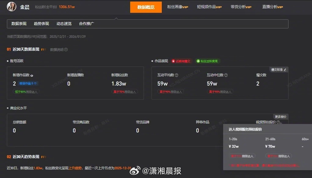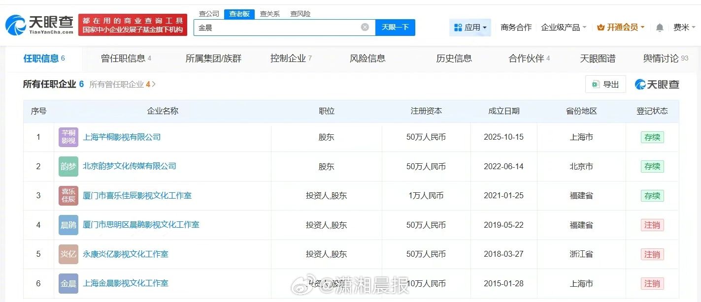 【#金晨今年已注销名下一工作室#,#金晨30日涨粉1.83万#】#警方通报金晨事件# 据媒体报道,1月30日,绍兴市公安局柯桥区分局发布警情通报,此前,“金晨被曝疑似涉嫌交通肇事逃逸”事件引发各界关注。潇湘晨报记者查询天眼查发现,金晨名下关联6家企业,其中3家为存续状态,包括上海芊桐影视有限公司、北京韵梦文化传媒有限公司等。值得一提的是,此前,金晨名下厦门市思明区晨鹃影视文化工作室的登记状态由存续变更为注销。第三方数据显示,截至1月30日下午5点,金晨现有粉丝1306.8万,视频平台账号近30日涨粉1.83万。商业化水平显示,其1-20s、21-60s视频预估报价分别为32万、70万。 上海