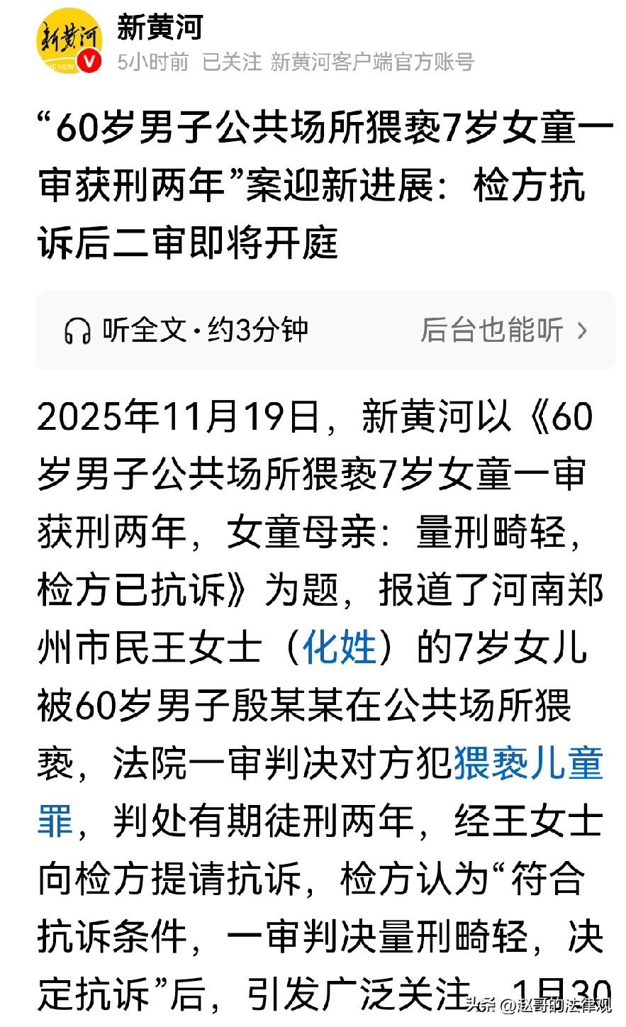 为老不尊!河南郑州,60岁男子,将同小区一7岁女童,带到小区花园,让女童站在他面前,把手伸进其衣服里抠摸下体,女童不堪忍受大声喊叫,男子才住手。男子曾因强 奸罪被判处刑罚,这次又因猥亵儿童罪,被法院判处有期徒刑2年。女童母亲认为量刑畸轻,坚持抗诉。目前该案将迎来再次开庭,二审会怎么判? 2025年2月4日,殷某某带着自己2岁的孙子,在他居住的小区大门口玩耍。 7岁的女童,带着她2岁的弟弟也跑过来玩。 殷某某看到两个孩子身边没有家长跟着,就起了坏心思。 他哄骗女童,让她带着弟弟和他一起去小区的小花园玩。 女童年纪小,这个爷爷也经常在小区里碰到,有时还跟他家的小孩一块玩,算是熟人。 女童就带着弟弟,跟着那个爷爷过去了。 到了小花园,四周静悄悄的,除了浓密的树木,连个人影也没有。 殷某某坐在亭子旁边的木凳上,哄着女童让站到他前面。 接下来,令人发指的事情发生了! 殷某某根本就不是个好啥,他是个惯犯,之前就因犯强 奸罪被判过刑。 这次他看到女童身边没有家人,岂肯放过她。 殷某某用左手伸进女童的上衣内,抚摸她的肚子。 女童当时可能就觉得不舒服,但还没反应过来是怎么回事。 殷某某并没有就此罢手,他将手伸进裤子里抠摸女童的下体,对女童实施了猥 亵行为。 女童反应过来,她害怕极了,大声喊叫着拒绝。 殷某某听到女童的喊叫,害怕被人听到,赶紧把手抽了出来。 整个过程,就发生在光天化日之下的小区公共场所。 女童受到惊吓后,哭喊着跑回了家,把这件事告诉了母亲王女士。 王女士一听,气得浑身发抖,她怎么也没想到,自己的女儿会在小区公共场所,遭遇这样的事情。 她立刻带着女儿去报了警,警方将殷某某抓获归案。 案件进入司法程序,法院经过调查,查明了上述发生的事实。 法院认为,殷某某猥亵儿童的行为,已经构成了猥亵儿童罪。 在量刑的时候,法院考虑了几个从重处罚的情节。 1、殷某某猥亵的是不满12周岁的儿童,按照法律规定,这种情况要从严惩处。 2、殷某某曾经因为强奸犯罪被判处过刑罚,这说明他是有前科的,再次犯罪,更应该从严处理。 3、殷某某是在公共场所当众猥亵儿童,这种行为非常恶劣,对社会的影响也很坏,依法要从重处罚。 但是,即便考虑了这么多从重处罚的情节。 法院一审,还是判决殷某某犯猥 亵儿童罪,判处有期徒刑2年。 王女士拿到这个判决结果后,又气又急,简直不敢相信自己的眼睛。 她觉得这个量刑太轻了,自己的女儿才7岁,就遭受了这样的伤害。 这可能会给女孩留下一辈子的心理阴影和心理创伤。 而且,殷某某还有前科,又在公共场所作案,两年有期徒刑,根本不足以惩罚他深恶的罪行。 王女士为了女儿,她没有沉默,而是以量刑畸轻为由,向检方申请抗诉。 此后,她四处奔走,收集各种证据,向检方详细说明了自己认为量刑过轻的理由。 她希望为年幼的女儿讨回一个公道。 2025年11月19日,新黄河报道了这一事件,标题直指“量刑畸轻,检方已抗诉”。 引发了人们的广泛关注,许多人和王女士有着同样的疑问。 在公共场所对幼女实施如此恶劣的猥亵行为,且有犯罪前科,为何只判了2年? 2025年11月14日,王女士终于等来了好消息,她的奔波和坚持没有白费。 检方经过审查,认为这起案件符合抗诉条件。 一审判决量刑畸轻,决定提起抗诉。 这个决定让王女士看到了希望,她觉得自己的努力终于有了结果。 据王女士称,该案定于2月2日,进行二审开庭审理。 她现在只希望法律能给出一个公正的裁决。 按照法律上的规定,该怎么判就怎么判,这是她最简单,也最坚定的诉求。 那么从法律的角度来分析,如何认定该案呢? 《刑法》第237条第3款:猥亵儿童的,处5年以下有期徒刑;有下列情形之一的,处5年以上有期徒刑: 1、猥亵儿童多人或者多次的; 2、聚众猥亵儿童的,或者在公共场所当众猥亵儿童,情节恶劣的; 首先,法律对猥 亵儿童罪的最低刑罚是5年以下有期徒刑。 但如果有上述4种加重情节之一,刑期将升至5年以上。 殷某某在小区公共场所,对7岁女童实施猥亵,且女童当场反抗并喊叫,符合“当众、的客观条件。 但需判断是否属于“情节恶劣”。 殷某某用手直接抠摸女童下体,属于对儿童身体隐私部位的直接侵害,手段较为恶劣。 殷某某曾因强 奸罪被判刑,虽不构成“累犯”,但属于“有犯罪前科”,法院可在量刑时酌定从重。 检方抗诉理由为“量刑畸轻”,若二审认定殷某某符合在公共场所当众猥亵且情节恶劣,或猥亵手段恶劣,则应适用5年以上有期徒刑。 检方抗诉后,法院需重新审视量刑是否充分体现从重情节。 结合高院司法解释,对幼女侵犯案件的“恶劣情节”认定较为严格。 二审改判,刑期可能在5-10年区间。 对此你怎么看?