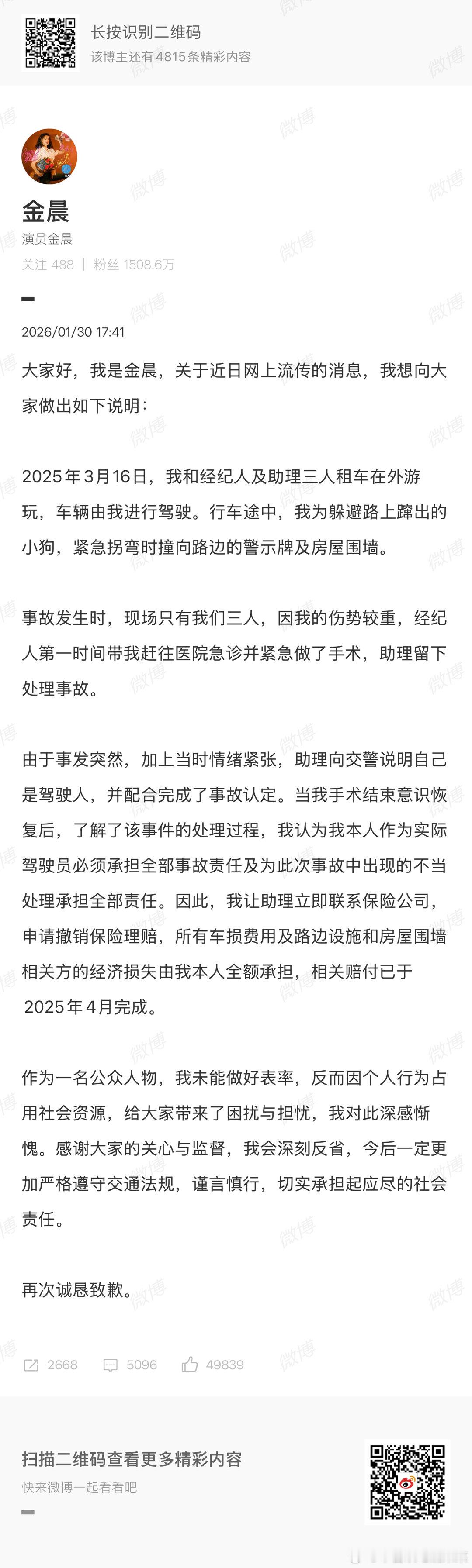蓝底白字来了金晨的声明也来了金晨被曝肇事逃逸被撞墙农户已获赔