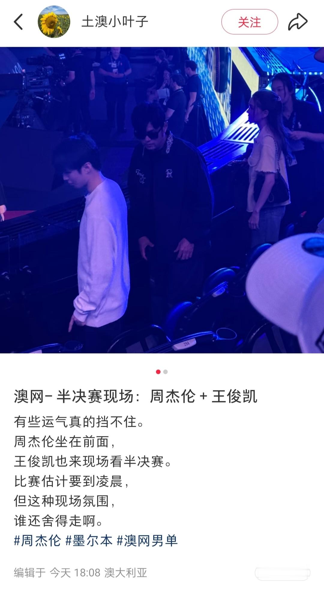 澳网半决赛偶遇王俊凯周杰伦网友在澳网半决赛现场偶遇王俊凯周杰伦了这是什么好运气啊又幸福了凯玩的开心!cr: 土澳小叶子周杰伦王俊凯去看澳网半决赛了