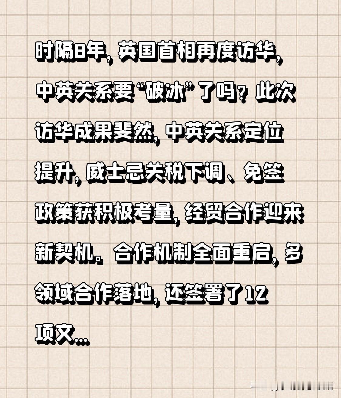 时隔8年,英国首相再度访华,中英关系要“破冰”了吗? 此次访华成果斐然,中英关系定位提升,威士忌关税下调、免签政策获积极考量,经贸合作迎来新契机。合作机制全面重启,多领域合作落地,还签署了12项文件。邯郸进出口贸易活跃,可借此深化与英合作。 中英合作加深,邯郸商机何在?你认为中英关系未来走向如何?来评论区聊聊,点赞收藏,一同关注国际合作新动态! 英国对华立场 英国对华贸易