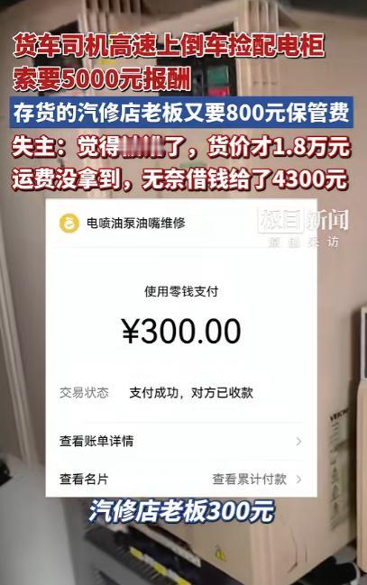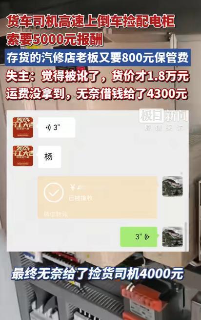 “脸都不要了!”一大货司机,在高速上掉了一个价值18000元的配电柜,之后发现是被一位卡友捡走,司机想要回配电柜,却被对方索要5000元“好处费”!事后司机吐槽:卡友何苦为难卡友? 跑大车的谁不是拿命换钱,风里来雨里去就盼着一趟活顺顺利利,可河北的贾师傅今年 1 月跑邢台到南宁的长途,愣是遇上了能记一辈子的糟心事。 1 月 18 日下午,贾师傅开着半挂车行至南宁绕城高速,这段路匝道多、路面还有些坑洼,跑了近2000 公里的车一路颠簸,绑着配电柜的尼龙绳愣是被磨断了。 贾师傅这趟的运费才16500元,货丢了的话,不仅运费泡汤,还得全额赔厂家的货钱,这对常年跑长途的他来说,无疑是天大的打击。 当时贾师傅隐约听见车后传来重物落地的闷响,可高速匝道窄、车流密,大货车根本没法就地停车,他只能硬着头皮往前开,到收费站后,第一时间停稳车报警,手心全是汗,生怕货被人捡走找不到。 交警接到求助后,立刻帮忙调取了高速沿线的监控录像,一番排查后终于有了线索,监控画面里清晰拍到,一辆大货车驶过配电柜掉落的位置后,竟然不顾高速行车规则,直接在高速上倒车,将掉在路边的配电柜装上车拉走了。 高速倒车本就是严重的交通违法行为,稍有不慎就可能引发连环交通事故,贾师傅看到监控画面时,又急又气,急的是货被捡走不知能否顺利拿回,气的是对方为了捡货竟无视高速安全规则。 随后贾师傅通过监控记录的车辆信息,再加上卡友圈的多方打听,终于联系上了捡走配电柜的杨师傅,那一刻贾师傅心里松了口气,想着都是跑卡车的同行,出门在外互相帮衬是常事。 自己肯定会好好感谢对方,给点辛苦费、买条烟都没问题,怎么也没想到,电话里杨师傅一开口就是5000元好处费,还撂下狠话,少于5000元免谈,就算贾师傅报警也不怕。 突如其来的高额索求让贾师傅瞬间懵了,他赶紧和杨师傅协商,坦言自己的难处,儿子刚结婚家里处处需要花钱,手头本就不宽裕,这趟运输本就没多少利润。 配电柜的价值甚至还没运费高,他先提出给1000元辛苦费,见对方不同意,又咬着牙加到2000元,可杨师傅态度十分强硬,一点都不肯松口。 无奈之下,贾师傅只能选择报警求助,本以为民警介入后事情能有转机,结果杨师傅依旧不肯让步,最后只松口把费用降到4000元,才肯告知贾师傅,配电柜被他拉到了河南老乡张老板开的汽修店里存放。 得到地址后,贾师傅马不停蹄地赶到那家汽修店,刚想上前拿回自己的配电柜,却被店主张老板拦了下来,对方称配电柜在他的店里存放了一段时间,产生了保管费,开口就要800元。 这一下让贾师傅彻底陷入了无奈,他赶紧给杨师傅打电话质问,说好的 4000 元好处费都答应给了,怎么又冒出一笔保管费,结果杨师傅只让他自己和汽修店协商,说完便直接拉黑了贾师傅的微信,再也联系不上。 走投无路的贾师傅只能再次报警,沙井派出所的民警赶到现场后从中协调,一番沟通下来,张老板才同意把保管费降到300元,这一来一回,贾师傅前前后后一共要拿出4300元,才能把配电柜拿回去。 可这4300元,对此时的贾师傅来说也是一笔不小的数目,跑长途的他身上只带了够加油、吃饭的现金,微信里的余额也远远不够。 情急之下,他只能在卡友群里厚着脸皮向同行借钱,一人借几百元,东拼西凑才凑够了4300元,把钱转出去后,终于拿回了自己的配电柜。 可让贾师傅没想到的是,这台配电柜掉落时产生了明显的摔损痕迹,送到南宁的目的地后,货主直接表示拒收,他只能又额外花了一笔物流费,把受损的配电柜发回河北的厂家。 目前厂家正在对配电柜进行定损,大概率会扣除相应的费用,而原本该到手的16000元运费,也因为货物未能顺利交付暂时拿不到手。 这笔4300元的费用,全是贾师傅向同行借的,自己这趟跑南宁的长途,不仅一分钱没赚,还倒贴了不少钱。 事后,贾师傅向当地交警部门投诉了杨师傅高速倒车捡货的行为,南宁市相关部门核实后表示,监控确实清晰拍到了杨师傅在高速上倒车的事实,公安部门已经调取了相关的录像资料,目前正在依法处理此事。 这件事在卡友圈里传开后,不少跑大车的司机都纷纷发表了自己的看法,遇上同行有难处都会伸手帮衬,从来没想过要什么好处费,顶多就是对方给包烟、这是卡友之间多年来的默契。 出门在外跑大车本就不容易,爬坡过坎、熬夜赶路,挣的都是血汗钱,卡友之间本应是互相搭把手、彼此体谅,而不是趁人之危索要高额费用,丢了货的司机本就心急如焚,再被这样为难,寒的是整个货运行业的心。 对于这件事,您有什么想说的吗?欢迎评论区留言讨论。 信源:2026-01-23——《货车司机高速上倒车捡配电柜索要5000元报酬,存货的汽修店老板又索要800元保管费,失主:觉得被讹了……》