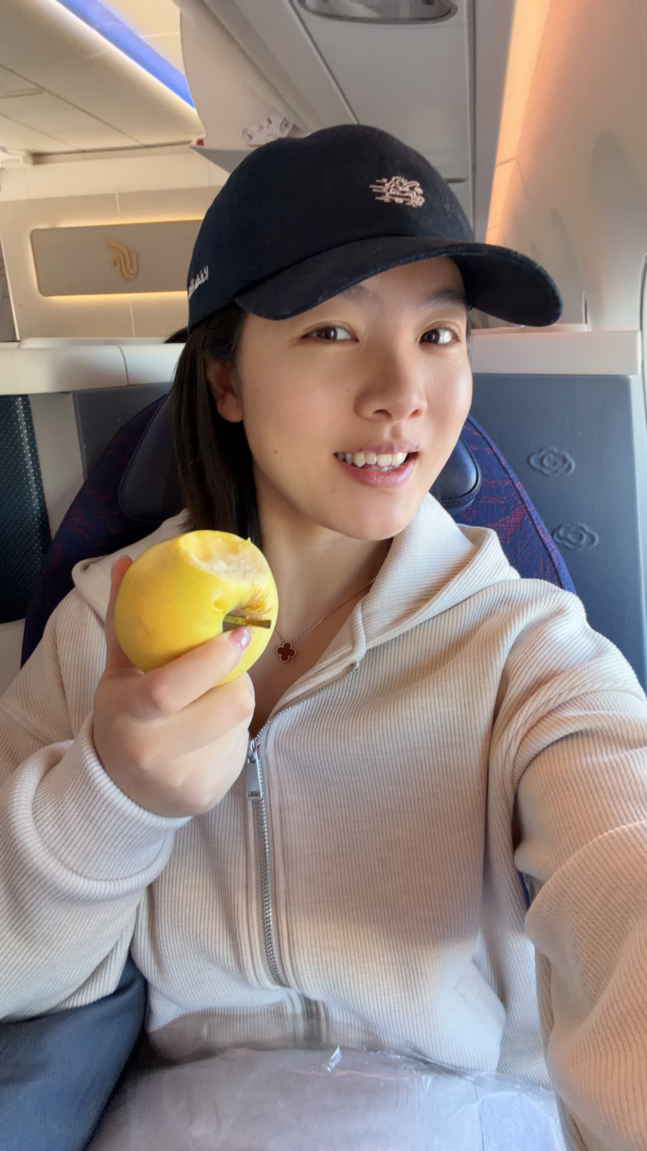 已登机,飞行11个小时吃个苹果,平平安安回家咯~