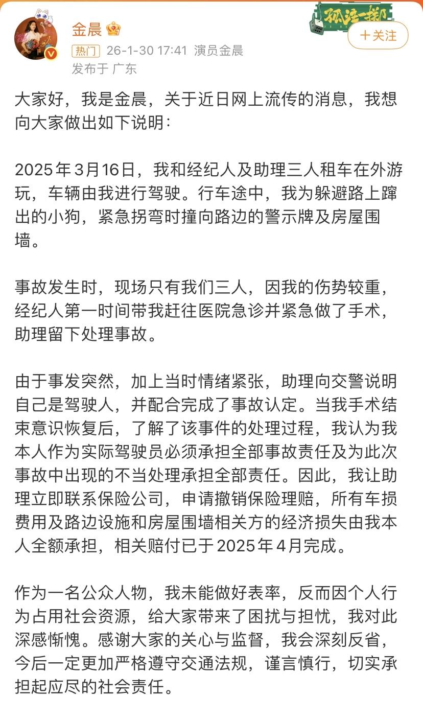 热搜事件大结局! 金晨进行了回应, 深感惭愧。 近期,关于明星金晨消息不断,今日,金晨主动做出了回应,具体内容如下图所示! 她把事情回顾了一下,表达清晰,没有进行任何逃避,主动承认并承担责任,并承诺更加严格遵守交通法规,也是深感惭愧,显得十分有担当! 她强调,当时也是受伤了,助理帮忙处理事情,也是情有可原,受伤了就要优先及时治疗。 终于真相大白,近期,网络上太多消息,真假难辨。可见,事出必有因,最终还会水落石出。 法律面前,人人平等,错的一方一定会承当该有的责任,只是时间早晚的问题。 如今,她已经认真回复,内心也是有着自责,解释清楚就好了,身为一名公共人物,太多人关注,确实应该做好表率,好的表率是榜样的基石。 笔者深有体会,看到一位老奶奶无奈坐在地上,眼神在望着人群,我发抖的慢慢上前去,用颤抖的双手扶起来老奶奶,然后小心翼翼的找个地方让她坐下休息。 当这位老奶奶坐下那一刻,我开心得笑了。正能量到处都有,需要每一个人去传递!