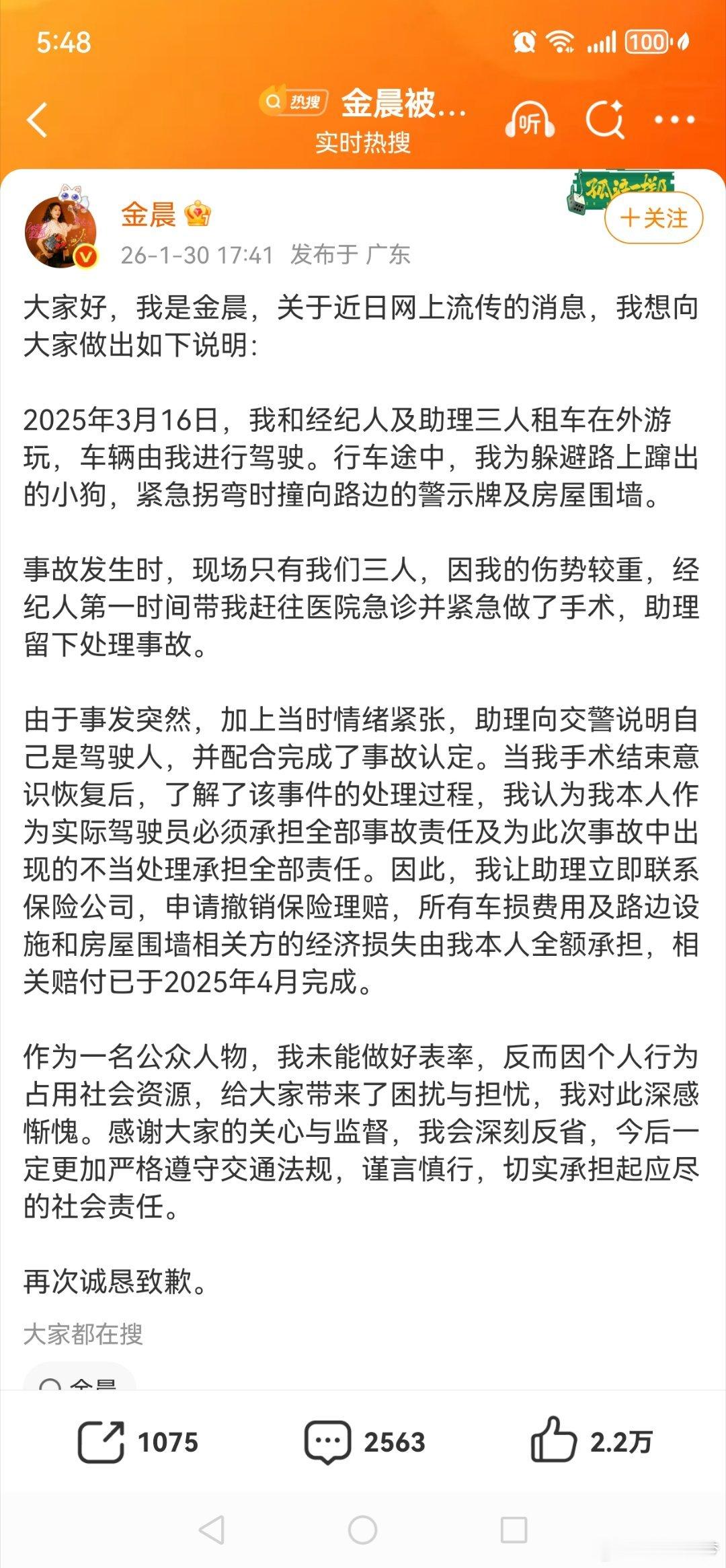 金晨发文道歉当时她们车上只是三个人,由于金晨的受伤,所以他就必须要去医院处理,留下一个助理在那看着现场,这是事情的大致经过吧!金晨受伤照片